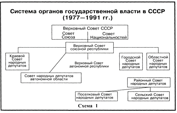 Конституция СССР 1977 г. В октябре 1977 г. внеочередная сессия Верховного Совета СССР приняла новую Конституцию. Предварительно проект Основного Закона был опубликован в центральной и местной печати. На предприятиях, в колхозах, в учебных заведениях прошло обсуждение конституционного документа. Широкое, свободное рассмотрение проекта Основного Закона расценивалось как доказательство преимуществ советской демократии перед буржуазной. В основу новой Конституции была положена концепция «развитого социализма». Его характеристика содержалась в преамбуле документа. Главным принципом государственной власти провозглашалось полновластие народа. Закреплялась утвержденная прежними Конституциями политическая основа государства — Советы. Отныне они стали называться Советами народных депутатов. Все Советы народных депутатов — Верховный Совет СССР, Верховные Советы союзных и автономных республик, краевые, областные и другие Советы составляли единую систему органов государственной власти. (схема 1)