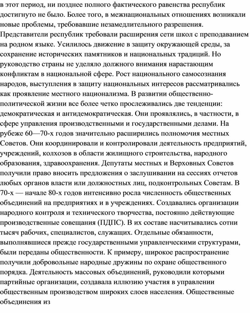 Две тенденции развития. В общественно-политической жизни 60—70-х годов происходили сложные и противоречивые процессы. Под видом борьбы с волюнтаризмом Н. С. Хрущева свертывались начатые им преобразования. В конце 1964 г. состоялось объединение промышленных и сельских партийных организаций. Позднее была упразднена территориальная система управления народным хозяйством. Устранялись искривления, допущенные в аграрной сфере, в частности по отношению к личному приусадебному хозяйству. Начался отход от курса десталинизации. В печати прекратились критика культа личности И. В. Сталина, разоблачение беззаконий сталинского режима. Вновь была ужесточена цензура. Как и прежде, ограничивался доступ к источникам научной информации — отечественной и зарубежной — для исследователей. Эта мера повлекла за собой тяжелые последствия для развития науки. В начале 70-х годов Л. И. Брежневым было заявлено о том, что в СССР достигнуто равенство республик по уровню экономики и культуры и что национальный вопрос в стране решен. Утверждалось также о складывании новой исторической общности — советского народа. Однако ни в этот период, ни позднее полного фактического равенства республик достигнуто не было. Более того, в межнациональных отношениях возникали новые проблемы, требовавшие незамедлительного разрешения. Представители республик требовали расширения сети школ с преподаванием на родном языке. Усилилось движение в защиту окружающей среды, за сохранение исторических памятников и национальных традиций. Но руководство страны не уделяло должного внимания нарастающим конфликтам в национальной сфере. Рост национального самосознания народов, выступления в защиту национальных интересов рассматривались как проявление местного национализма. В развитии общественно-политической жизни все более четко прослеживались две тенденции: демократическая и антидемократическая. Они проявлялись, в частности, в сфере управления производственными и государственными делами. На рубеже 60—70-х годов значительно расширились полномочия местных Советов. Они координировали и контролировали деятельность предприятий, учреждений, колхозов в области жилищного строительства, народного образования, здравоохранения. Депутаты местных и Верховных Советов получили право вносить предложения о заслушивании на сессиях отчетов любых органов власти или должностных лиц, подконтрольных Советам. В 70-х — начале 80-х годов интенсивно росла численность общественных объединений на предприятиях и в учреждениях. Создавались организации народного контроля и технического творчества, постоянно действующие производственные совещания (ПДПС). В их составе насчитывались сотни тысяч рабочих, специалистов, служащих. Отдельные обязанности, выполнявшиеся прежде государственными управленческими структурами, были переданы общественности. К примеру, широкое распространение получили добровольные народные дружины по охране общественного порядка. Деятельность массовых объединений, руководили которыми партийные организации, создавала иллюзию участия в управлении общественным производством широких слоев населения. Общественные объединения из представителей различных категорий населения действовали при местных Советах. Но социальный состав самих Советов, соотношение в нем ра
