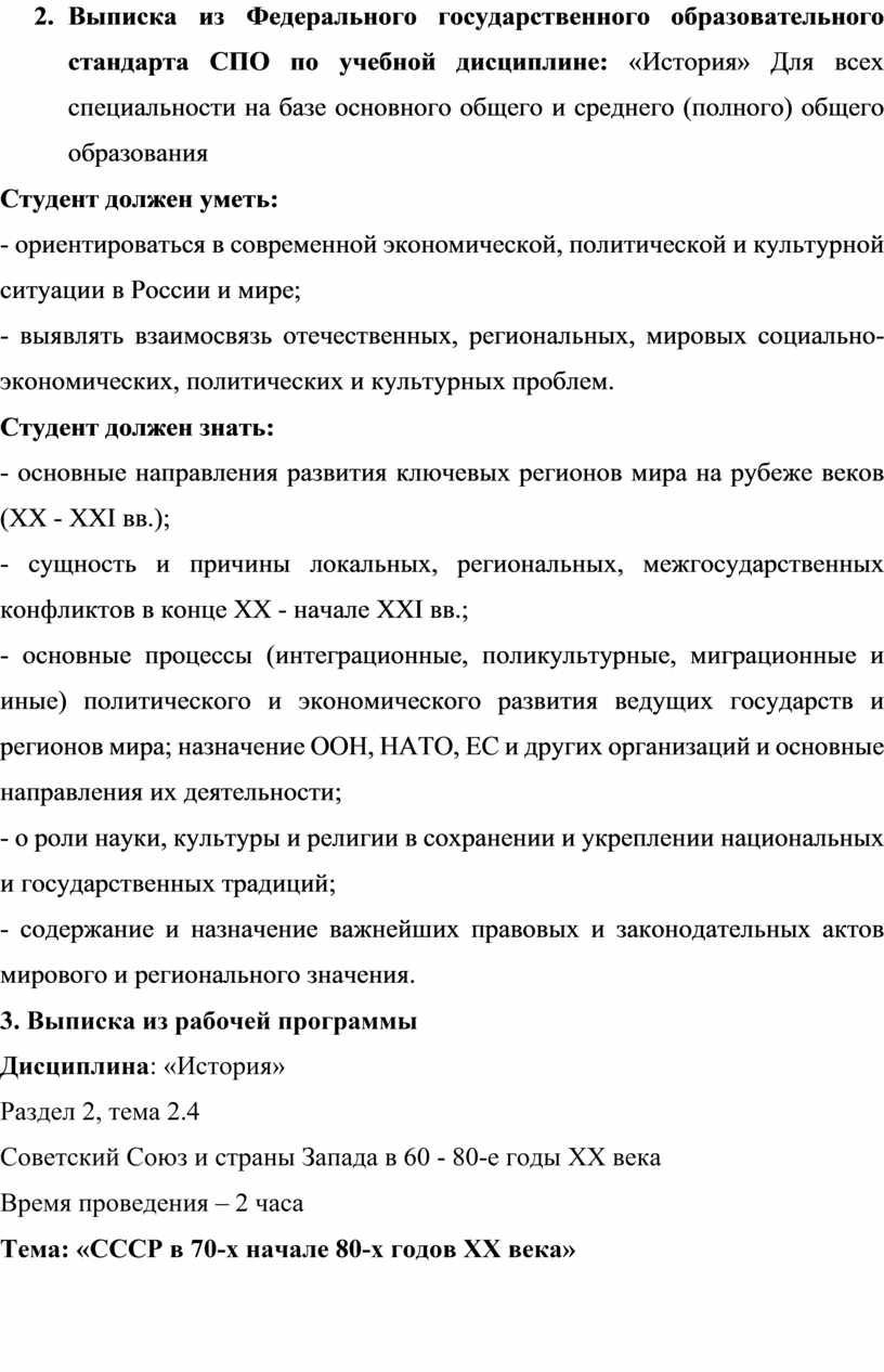 2. Выписка из Федерального государственного образовательного стандарта СПО по учебной дисциплине: «История» Для всех специальности на базе основного общего и среднего (полного) общего образования