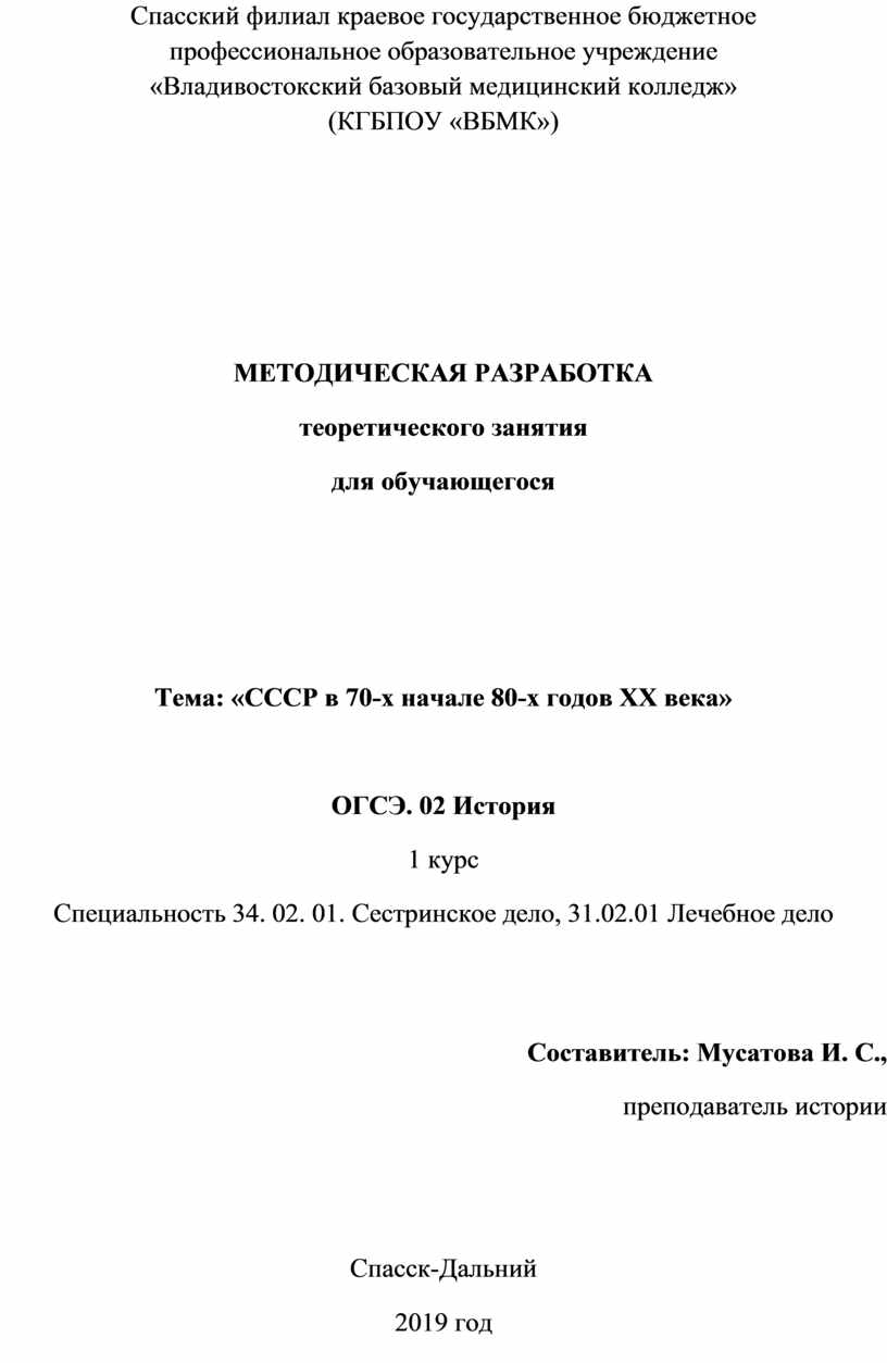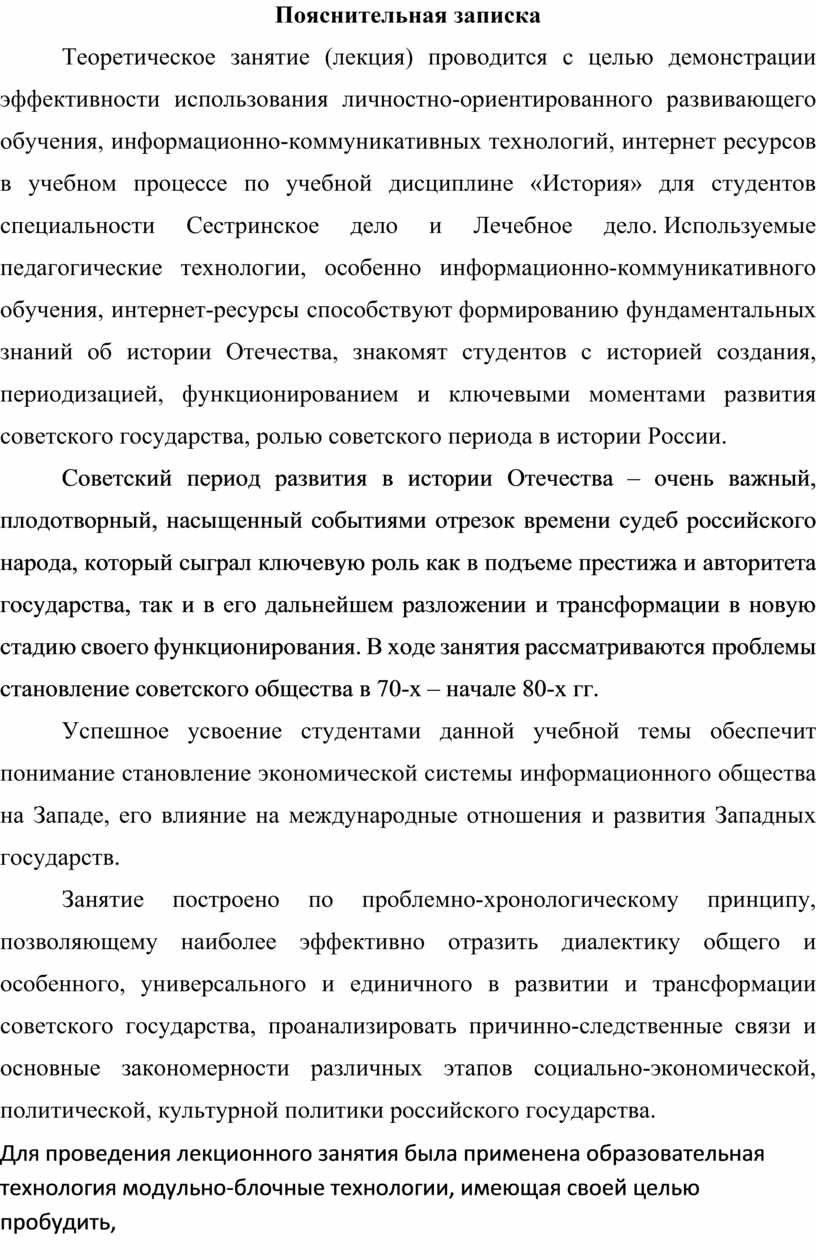 Теоретическое занятие (лекция) проводится с целью демонстрации эффективности использования личностно-ориентированного развивающего обучения, информационно-коммуникативных технологий, интернет ресурсов в учебном процессе по учебной дисциплине «История» для студентов специальности Сестринское дело и Лечебное дело. Используемые педагогические технологии, особенно информационно-коммуникативного обучения, интернет-ресурсы способствуют формированию фундаментальных знаний об истории Отечества, знакомят студентов с историей создания, периодизацией, функционированием и ключевыми моментами развития советского государства, ролью советского периода в истории России.