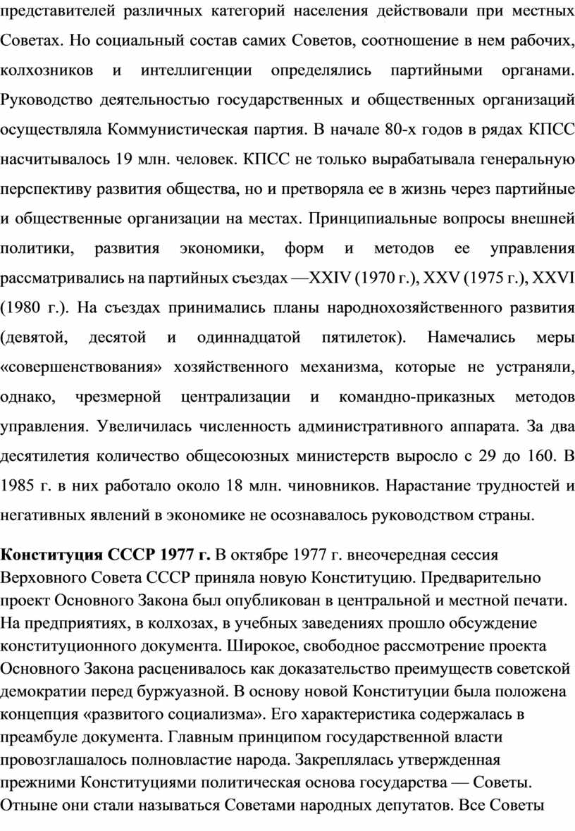 1) властвовали безраздельно консервативные тенденции. Получила официальное одобрение концепция развитого социализма, согласно которой медленное, планомерное, постепенное совершенствование реального социализма, построенного в СССР «полностью и окончательно», займет целую историческую эпоху. В 1977 г. она была законодательно закреплена во вступлении к новой Конституции СССР. Также был закреплен Конституцией тезис о руководящей и направляющей роли КПСС;