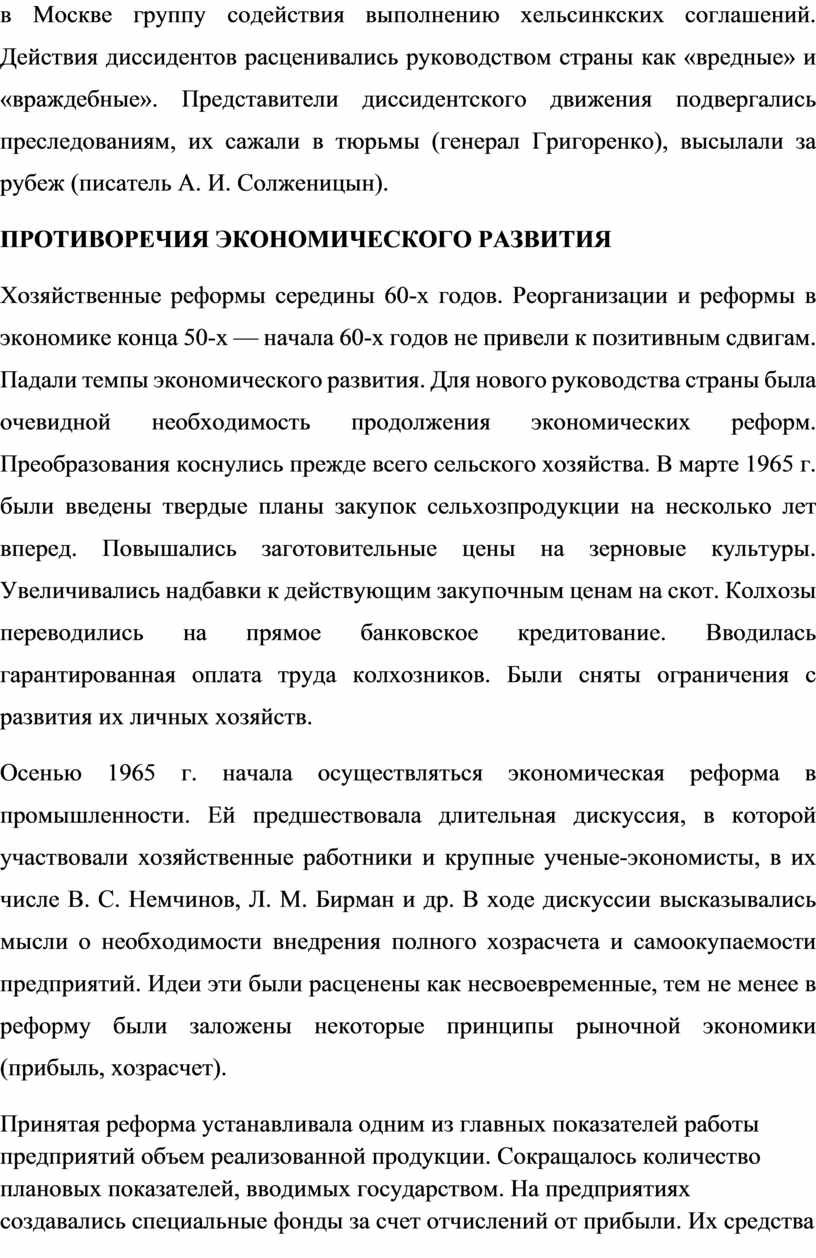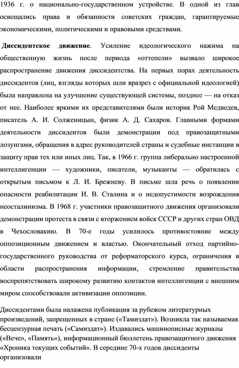 Диссидентское движение. Усиление идеологического нажима на общественную жизнь после периода «оттепели» вызвало широкое распространение движения диссидентства. На первых порах деятельность диссидентов (лиц, взгляды которых шли вразрез с официальной идеологией) была направлена на улучшение существующей системы, позднее — на отказ от нее. Наиболее яркими их представителями были историк Рой Медведев, писатель А. И. Солженицын, физик А. Д. Сахаров. Главными формами деятельности диссидентов были демонстрации под правозащитными лозунгами, обращения в адрес руководителей страны и судебные инстанции в защиту прав тех или иных лиц. Так, в 1966 г. группа либерально настроенной интеллигенции — художники, писатели, музыканты — обратилась с открытым письмом к Л. И. Брежневу. В письме шла речь о появлении опасности реабилитации И. В. Сталина и о недопустимости возрождения неосталинизма. В 1968 г. участники правозащитного движения организовали демонстрации протеста в связи с вторжением войск СССР и других стран ОВД в Чехословакию. В 70-е годы усилилось противостояние между оппозиционным движением и властью. Окончательный отход партийно-государственного руководства от реформаторского курса, ограничения в области распространения информации, стремление правительства воспрепятствовать широкому развитию контактов интеллигенции с внешним миром способствовали активизации оппозиции.