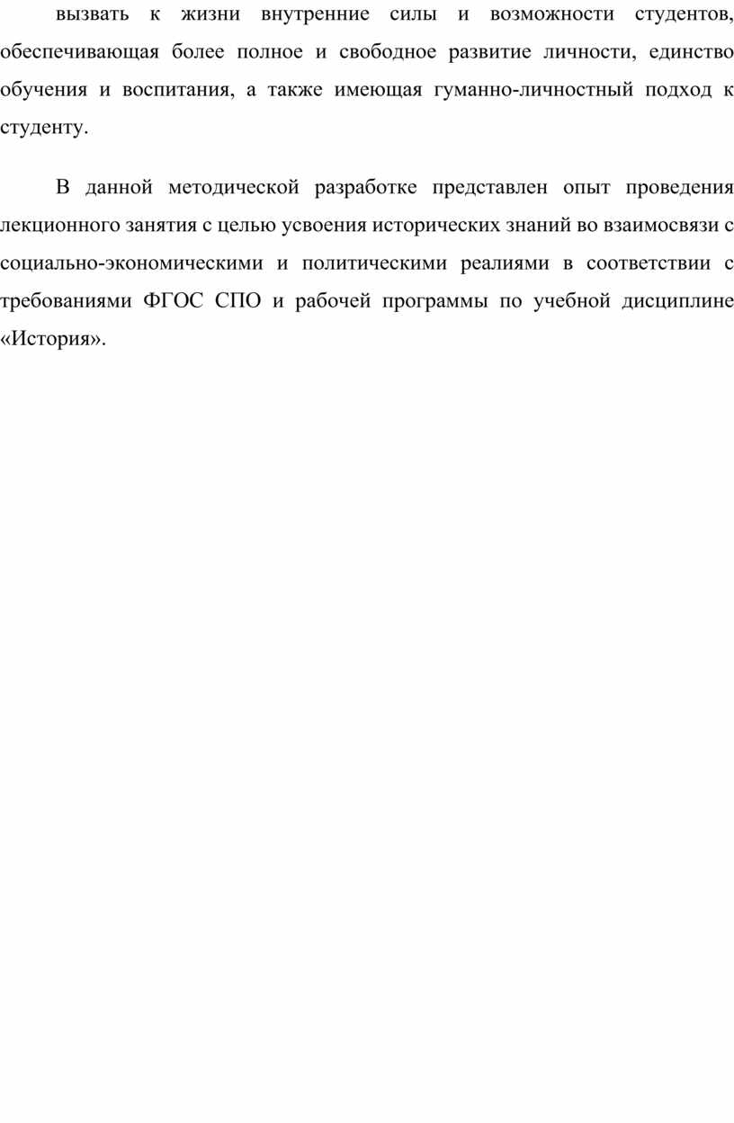 В данной методической разработке представлен опыт проведения лекционного занятия с целью усвоения исторических знаний во взаимосвязи с социально-экономическими и политическими реалиями в соответствии с требованиями ФГОС СПО и рабочей программы по учебной дисциплине «История».