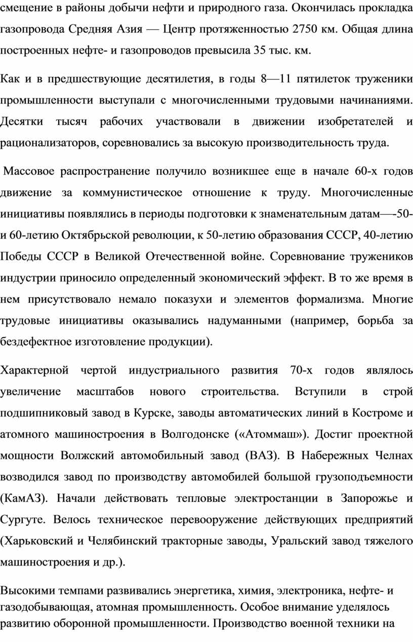 Высокими темпами развивались энергетика, химия, электроника, нефте- и газодобывающая, атомная промышленность. Особое внимание уделялось развитию оборонной промышленности. Производство военной техники на машиностроительных предприятиях достигало 60% всей выпускаемой ими продукции. В период десятой пятилетки (1976—1980 гг.) была сделана попытка перевести промышленность на путь интенсивного развития. «Пятилетка эффективности и качества»— так называлась она в официальных документах. Однако намеченные планы по внедрению новой техники и росту производительности труда выполнены не были. Более того, наметилось серьезное отставание во всех индустриальных отраслях.