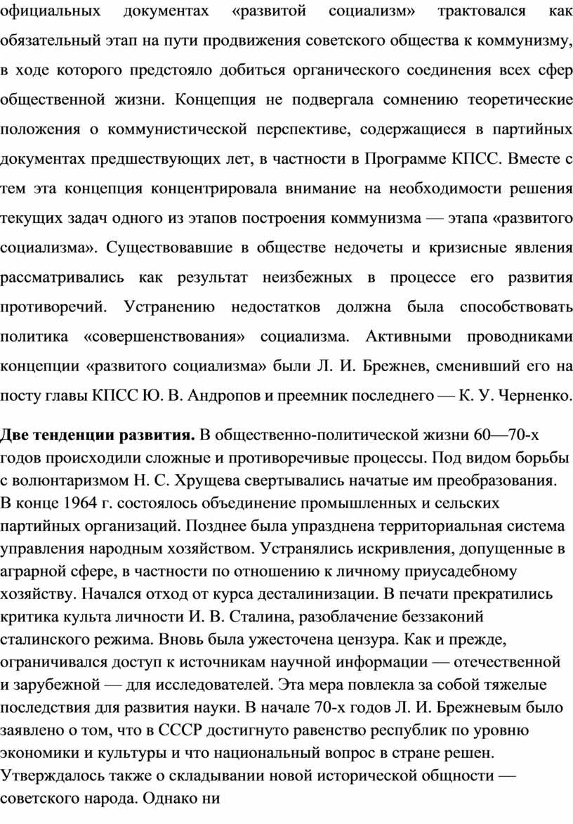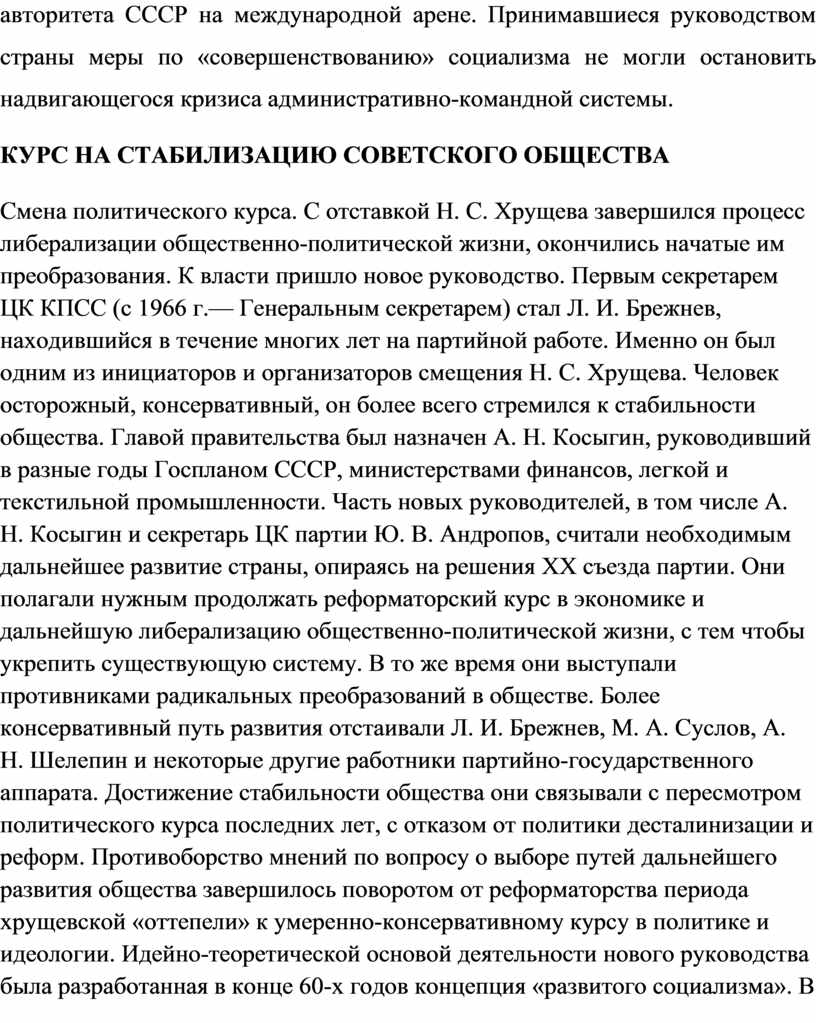 Смена политического курса. С отставкой Н. С. Хрущева завершился процесс либерализации общественно-политической жизни, окончились начатые им преобразования. К власти пришло новое руководство. Первым секретарем ЦК КПСС (с 1966 г.— Генеральным секретарем) стал Л. И. Брежнев, находившийся в течение многих лет на партийной работе. Именно он был одним из инициаторов и организаторов смещения Н. С. Хрущева. Человек осторожный, консервативный, он более всего стремился к стабильности общества. Главой правительства был назначен А. Н. Косыгин, руководивший в разные годы Госпланом СССР, министерствами финансов, легкой и текстильной промышленности. Часть новых руководителей, в том числе А. Н. Косыгин и секретарь ЦК партии Ю. В. Андропов, считали необходимым дальнейшее развитие страны, опираясь на решения XX съезда партии. Они полагали нужным продолжать реформаторский курс в экономике и дальнейшую либерализацию общественно-политической жизни, с тем чтобы укрепить существующую систему. В то же время они выступали противниками радикальных преобразований в обществе. Более консервативный путь развития отстаивали Л. И. Брежнев, М. А. Суслов, А. Н. Шелепин и некоторые другие работники партийно-государственного аппарата. Достижение стабильности общества они связывали с пересмотром политического курса последних лет, с отказом от политики десталинизации и реформ. Противоборство мнений по вопросу о выборе путей дальнейшего развития общества завершилось поворотом от реформаторства периода хрущевской «оттепели» к умеренно-консервативному курсу в политике и идеологии. Идейно-теоретической основой деятельности нового руководства была разработанная в конце 60-х годов концепция «развитого социализма». В официальных документах «развитой социализм» трактовался как обязательный этап на пути продвижения советского общества к коммунизму, в ходе которого предстояло добиться органического соединения всех сфер общественной жизни. Концепция не подвергала сомнению теоретические положения о коммунистической перспективе, содержащиеся в партийных документах предшествующих лет, в частности в Программе КПСС. Вместе с тем эта концепция концентрировала внимание на необходимости решения текущих задач одного из этапов построения коммунизма — этапа «развитого социализма». Существовавшие в обществе недочеты и кризисные явления рассматривались как результат неизбежных в процессе его развития противоречий. Устранению недостатков должна была способствовать политика «совершенствования» социализма. Активными проводниками концепции «развитого социализма» были Л. И. Брежнев, сменивший его на посту главы КПСС Ю. В. Андропов и преемник последнего — К. У. Черненко.