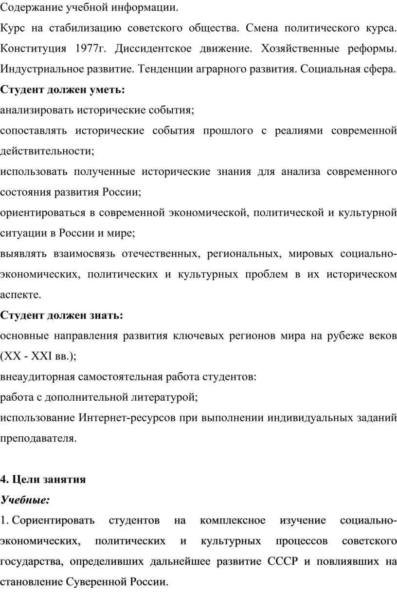 1. Сориентировать студентов на комплексное изучение социально-экономических, политических и культурных процессов советского государства, определивших дальнейшее развитие СССР и повлиявших на становление Суверенной России.