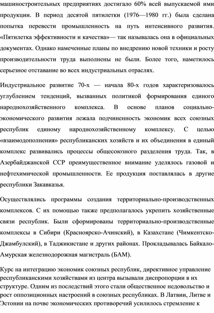 Индустриальное развитие 70-х — начала 80-х годов характеризовалось углублением тенденций, вызванных политикой формирования единого народнохозяйственного комплекса. В основе планов социально-экономического развития лежала подчиненность экономик всех союзных республик единому народнохозяйственному комплексу. С целью «взаимодополнения» республиканских хозяйств и их объединения в единый комплекс развивались процессы общесоюзного разделения труда. Так, в Азербайджанской ССР преимущественное внимание уделялось газовой и нефтехимической промышленности. Ее продукция поставлялась в другие республики Закавказья.