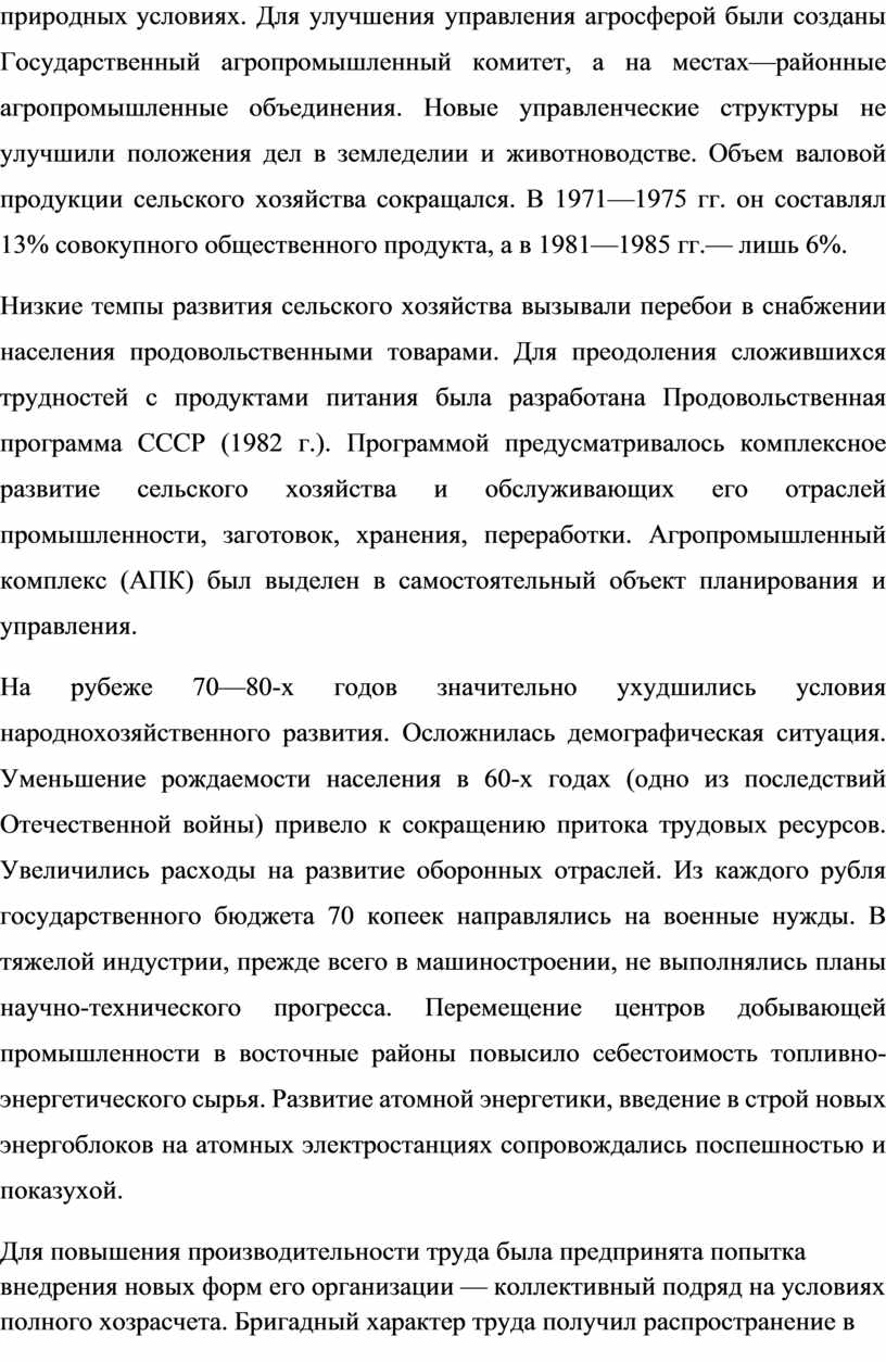 На рубеже 70—80-х годов значительно ухудшились условия народнохозяйственного развития. Осложнилась демографическая ситуация. Уменьшение рождаемости населения в 60-х годах (одно из последствий Отечественной войны) привело к сокращению притока трудовых ресурсов. Увеличились расходы на развитие оборонных отраслей. Из каждого рубля государственного бюджета 70 копеек направлялись на военные нужды. В тяжелой индустрии, прежде всего в машиностроении, не выполнялись планы научно-технического прогресса. Перемещение центров добывающей промышленности в восточные районы повысило себестоимость топливно-энергетического сырья. Развитие атомной энергетики, введение в строй новых энергоблоков на атомных электростанциях сопровождались поспешностью и показухой.