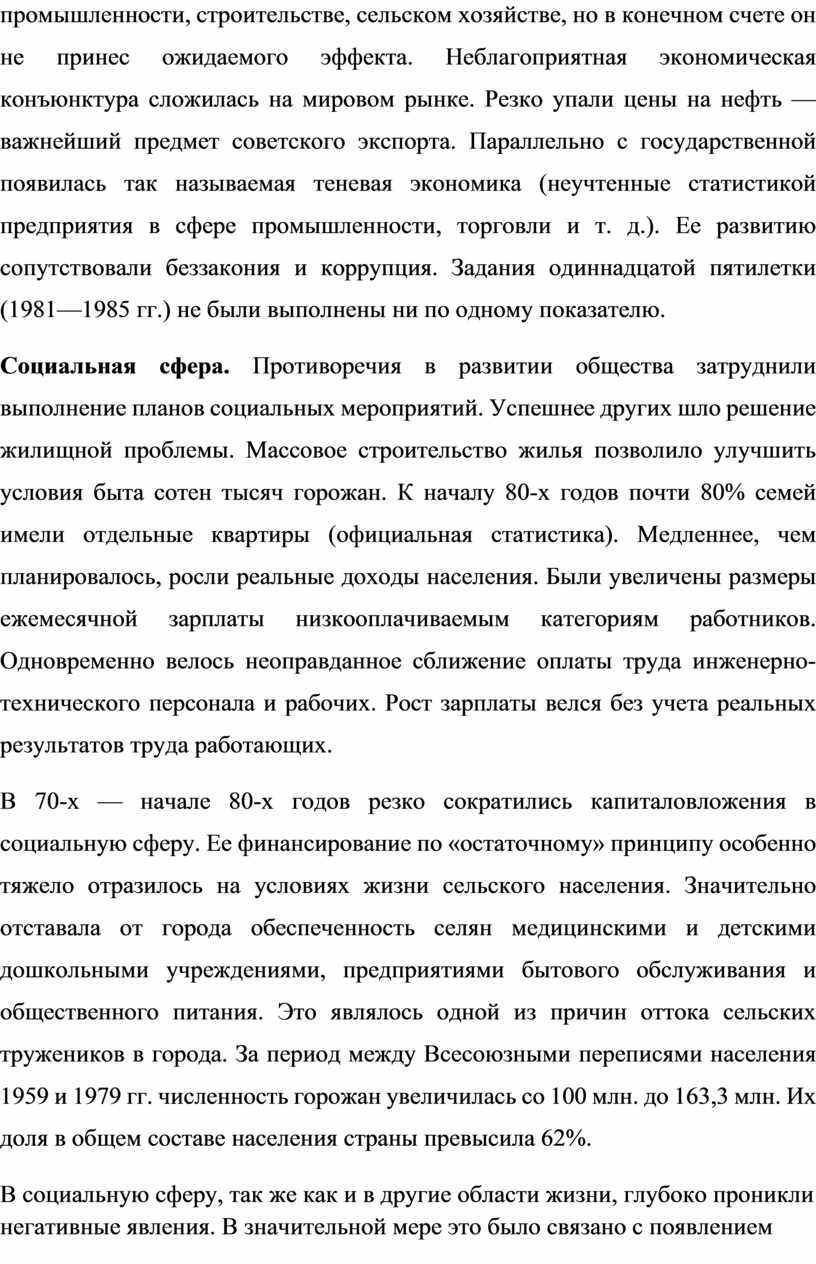 Социальная сфера. Противоречия в развитии общества затруднили выполнение планов социальных мероприятий. Успешнее других шло решение жилищной проблемы. Массовое строительство жилья позволило улучшить условия быта сотен тысяч горожан. К началу 80-х годов почти 80% семей имели отдельные квартиры (официальная статистика). Медленнее, чем планировалось, росли реальные доходы населения. Были увеличены размеры ежемесячной зарплаты низкооплачиваемым категориям работников. Одновременно велось неоправданное сближение оплаты труда инженерно-технического персонала и рабочих. Рост зарплаты велся без учета реальных результатов труда работающих.