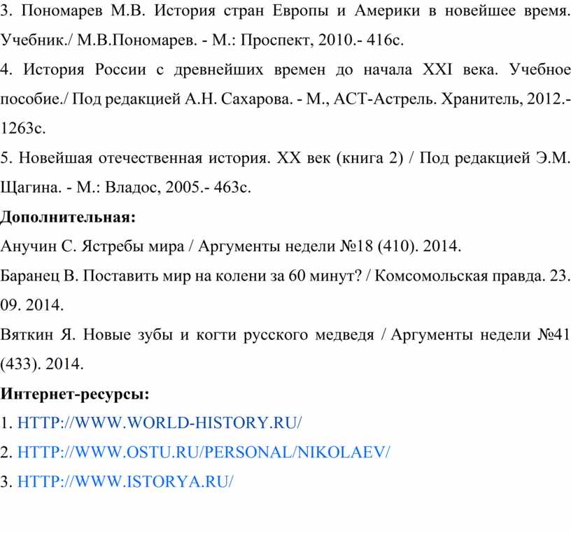 3. Пономарев М.В. История стран Европы и Америки в новейшее время. Учебник./ М.В.Пономарев. - М.: Проспект, 2010.- 416с.