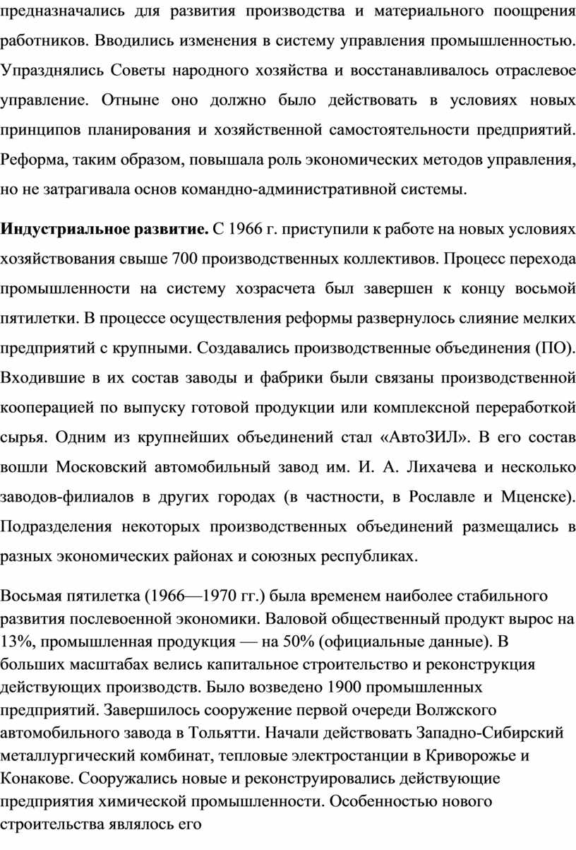Индустриальное развитие. С 1966 г. приступили к работе на новых условиях хозяйствования свыше 700 производственных коллективов. Процесс перехода промышленности на систему хозрасчета был завершен к концу восьмой пятилетки. В процессе осуществления реформы развернулось слияние мелких предприятий с крупными. Создавались производственные объединения (ПО). Входившие в их состав заводы и фабрики были связаны производственной кооперацией по выпуску готовой продукции или комплексной переработкой сырья. Одним из крупнейших объединений стал «АвтоЗИЛ». В его состав вошли Московский автомобильный завод им. И. А. Лихачева и несколько заводов-филиалов в других городах (в частности, в Рославле и Мценске). Подразделения некоторых производственных объединений размещались в разных экономических районах и союзных республиках.
