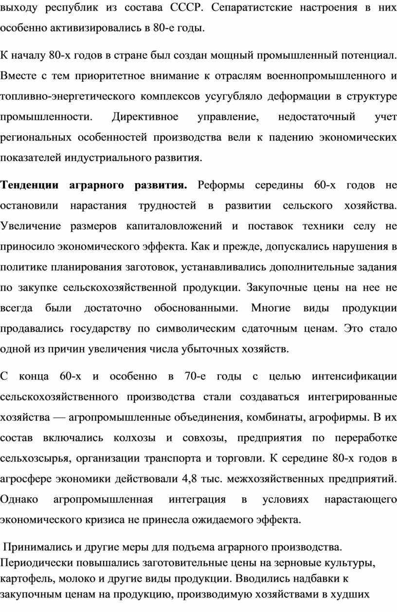 К началу 80-х годов в стране был создан мощный промышленный потенциал. Вместе с тем приоритетное внимание к отраслям военнопромышленного и топливно-энергетического комплексов усугубляло деформации в структуре промышленности. Директивное управление, недостаточный учет региональных особенностей производства вели к падению экономических показателей индустриального развития.