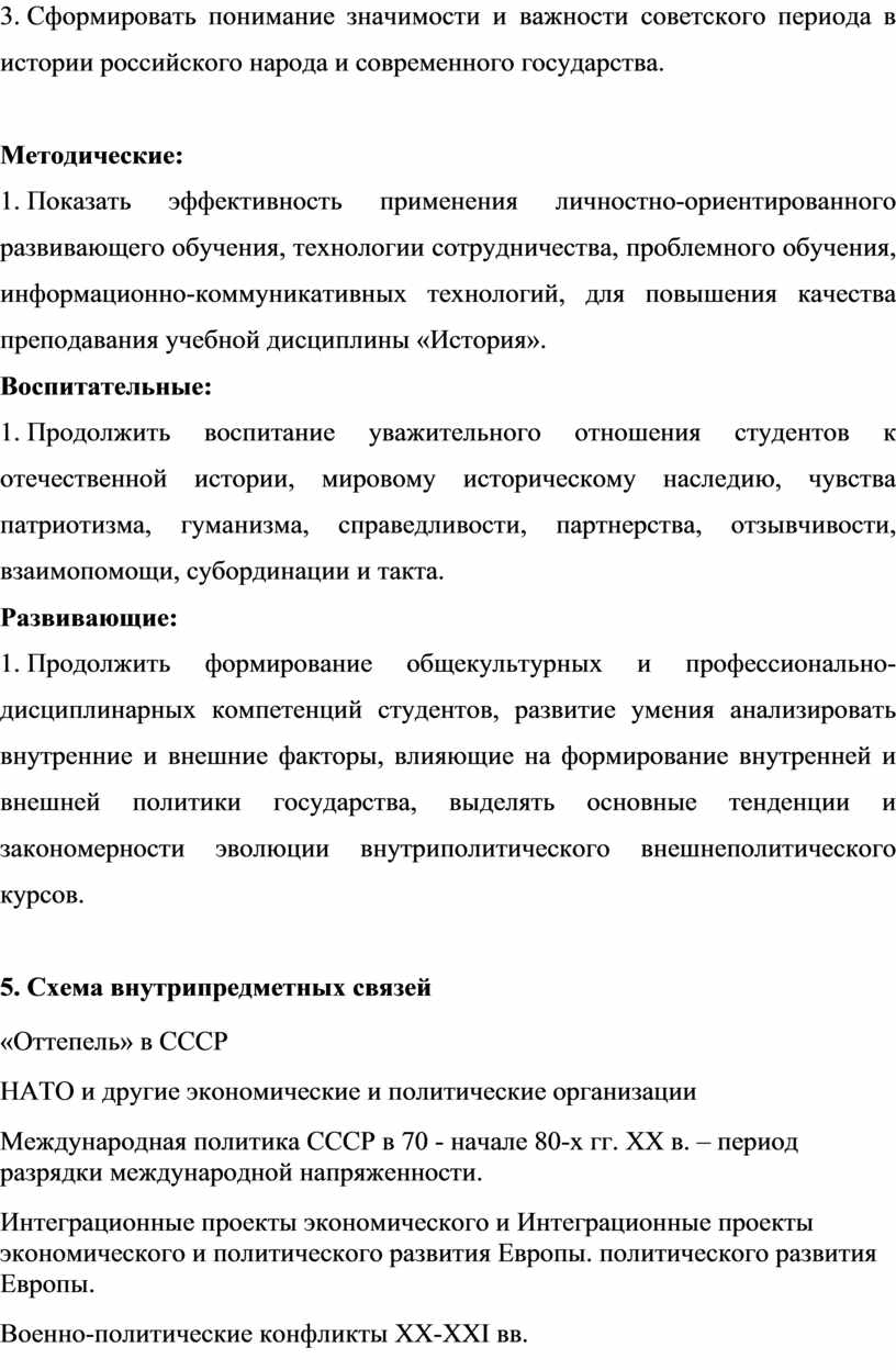 1. Продолжить формирование общекультурных и профессионально-дисциплинарных компетенций студентов, развитие умения анализировать внутренние и внешние факторы, влияющие на формирование внутренней и внешней политики государства, выделять основные тенденции и закономерности эволюции внутриполитического внешнеполитического курсов.