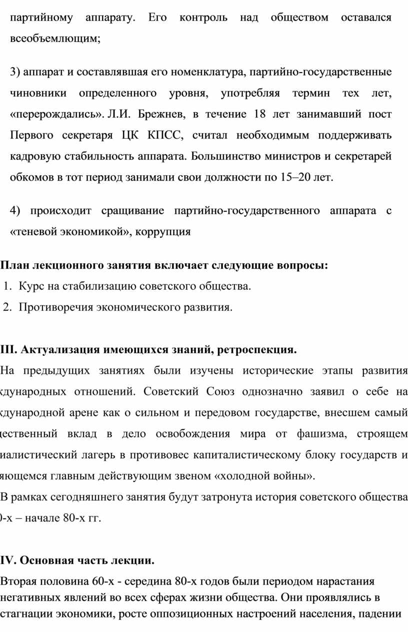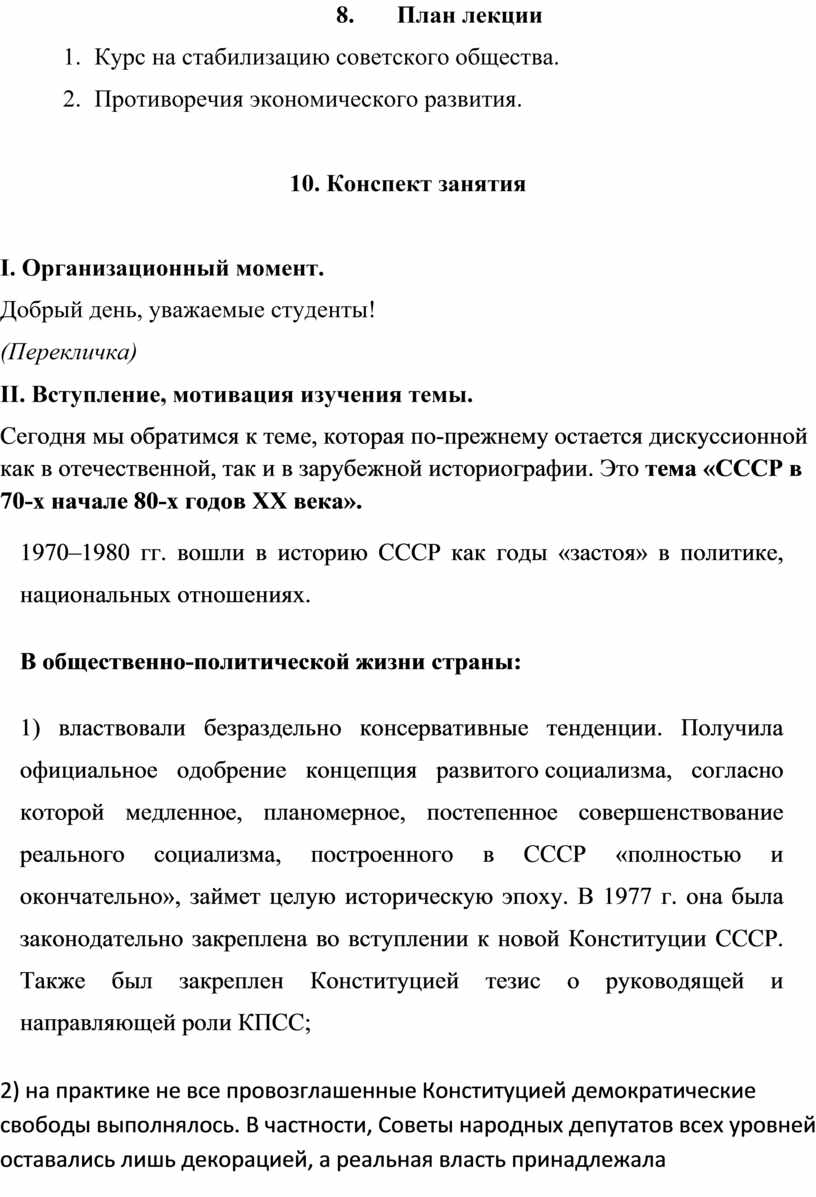 Советский период развития в истории Отечества – очень важный, плодотворный, насыщенный событиями отрезок времени судеб российского народа, который сыграл ключевую роль как в подъеме престижа и авторитета государства, так и в его дальнейшем разложении и трансформации в новую стадию своего функционирования. В ходе занятия рассматриваются проблемы становление советского общества в 70-х – начале 80-х гг.