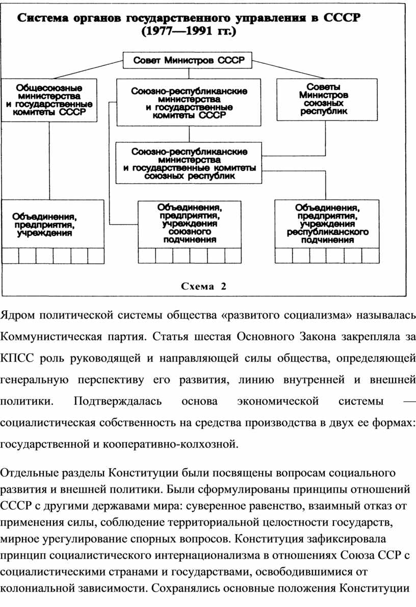 Ядром политической системы общества «развитого социализма» называлась Коммунистическая партия. Статья шестая Основного Закона закрепляла за КПСС роль руководящей и направляющей силы общества, определяющей генеральную перспективу его развития, линию внутренней и внешней политики. Подтверждалась основа экономической системы — социалистическая собственность на средства производства в двух ее формах: государственной и кооперативно-колхозной.