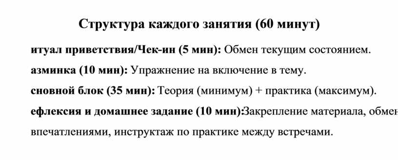1. Ритуал приветствия/Чек-ин (5 мин): Обмен текущим состоянием.