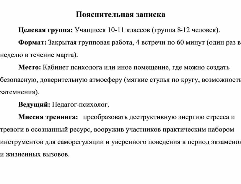Миссия тренинга: преобразовать деструктивную энергию стресса и тревоги в осознанный ресурс, вооружив участников практическим набором инструментов для саморегуляции и уверенного поведения в период экзаменов и жизненных вызовов.