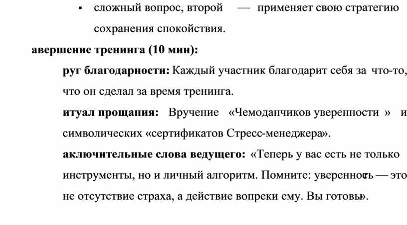 o Заключительные слова ведущего: «Теперь у вас есть не только инструменты, но и личный алгоритм. Помните: уверенность — это не отсутствие страха, а действие вопреки ему. Вы готовы».