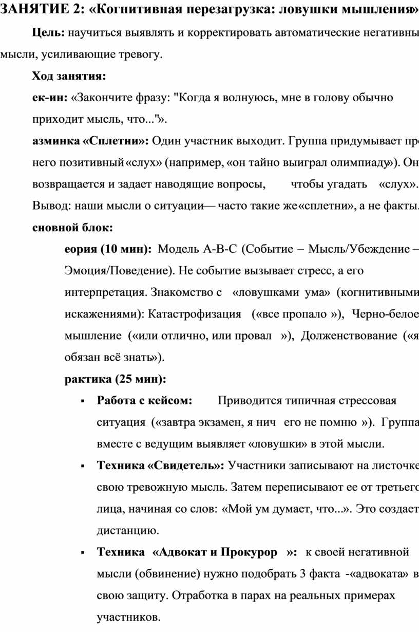 o Теория (10 мин): Модель A-B-C (Событие – Мысль/Убеждение – Эмоция/Поведение). Не событие вызывает стресс, а его интерпретация. Знакомство с «ловушками ума» (когнитивными искажениями): Катастрофизация («все пропало»), Черно-белое мышление («или отлично, или провал»), Долженствование («я обязан всё знать»).