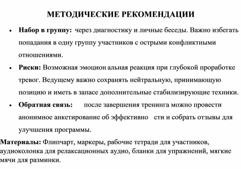 · Материалы: Флипчарт, маркеры, рабочие тетради для участников, аудиоколонка для релаксационных аудио, бланки для упражнений, мягкие мячи для разминки.