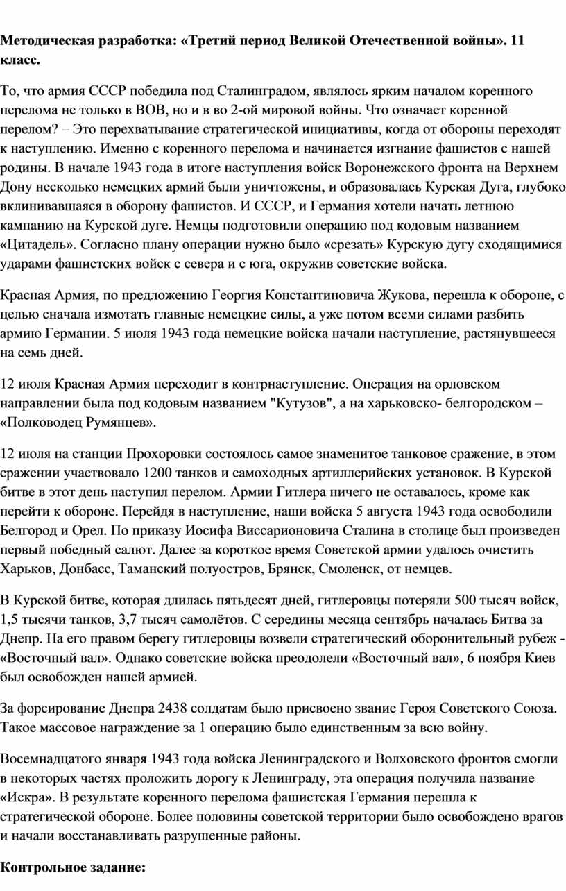 Методическая разработка: «Третий период Великой Отечественной войны». 11 класс.