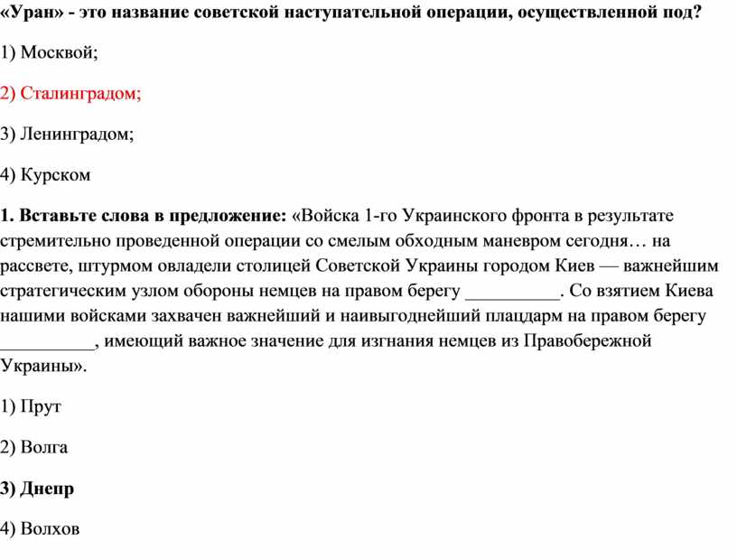 1. Вставьте слова в предложение: «Войска 1-го Украинского фронта в результате стремительно проведенной операции со смелым обходным маневром сегодня… на рассвете, штурмом овладели столицей Советской Украины городом Киев — важнейшим стратегическим узлом обороны немцев на правом берегу __________. Со взятием Киева нашими войсками захвачен важнейший и наивыгоднейший плацдарм на правом берегу __________, имеющий важное значение для изгнания немцев из Правобережной Украины».