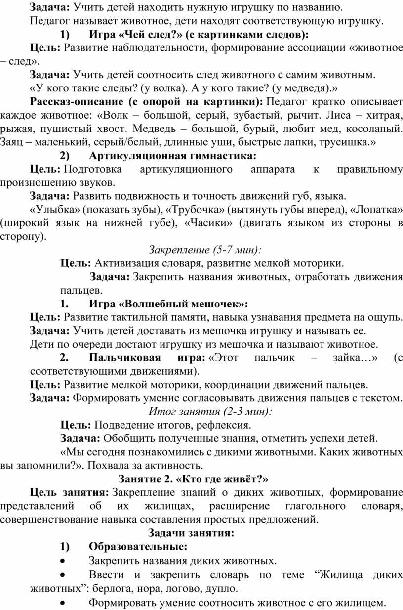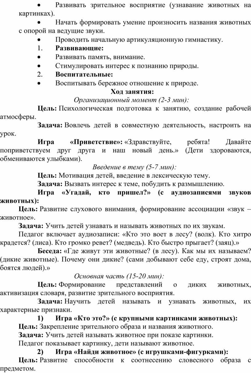 Цель занятия: Расширение и активизация словарного запаса по теме «Дикие животные», формирование навыка узнавания и называния животных, развитие слухового внимания и зрительного восприятия.