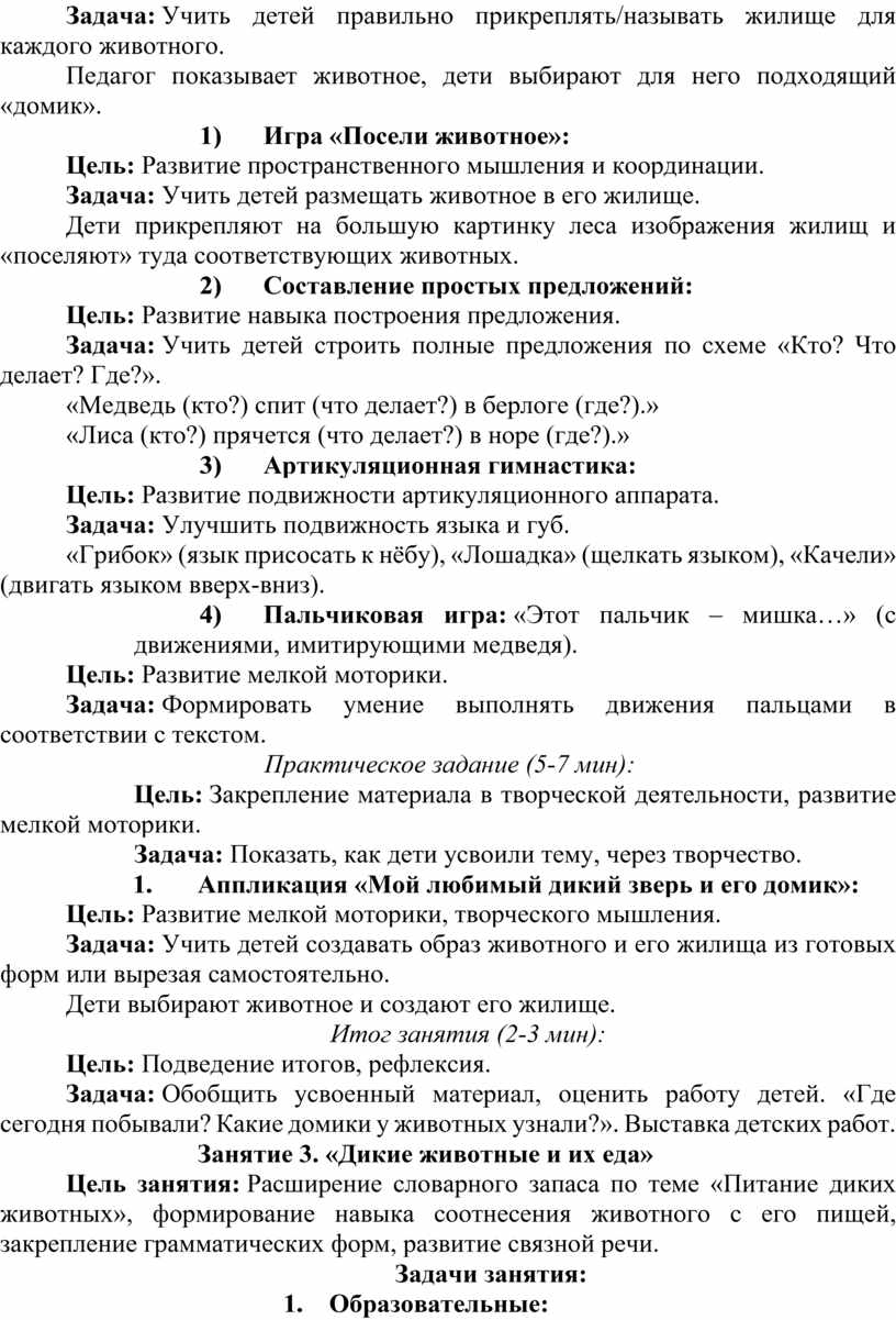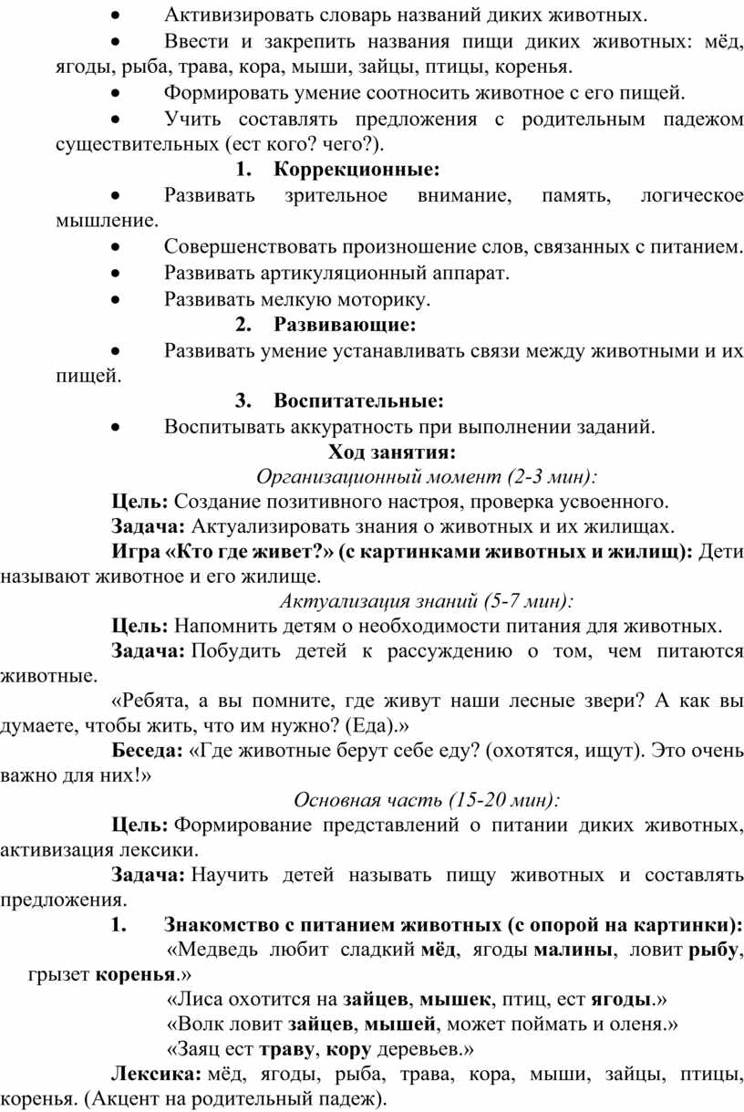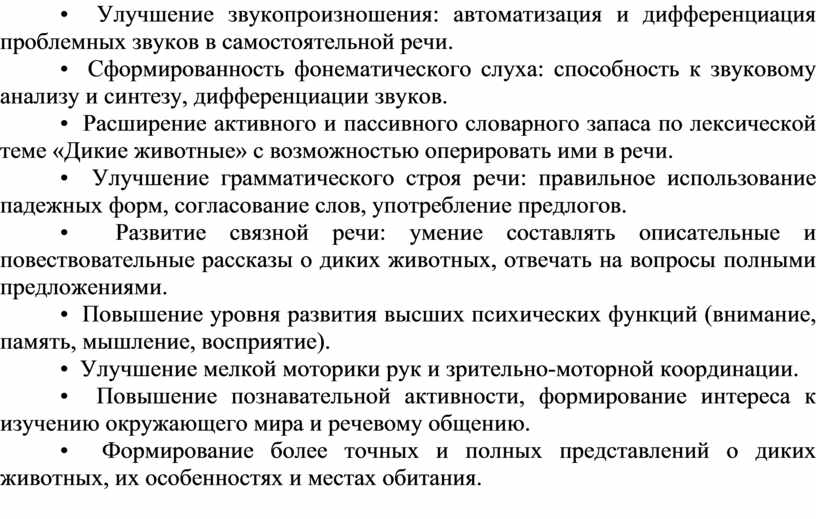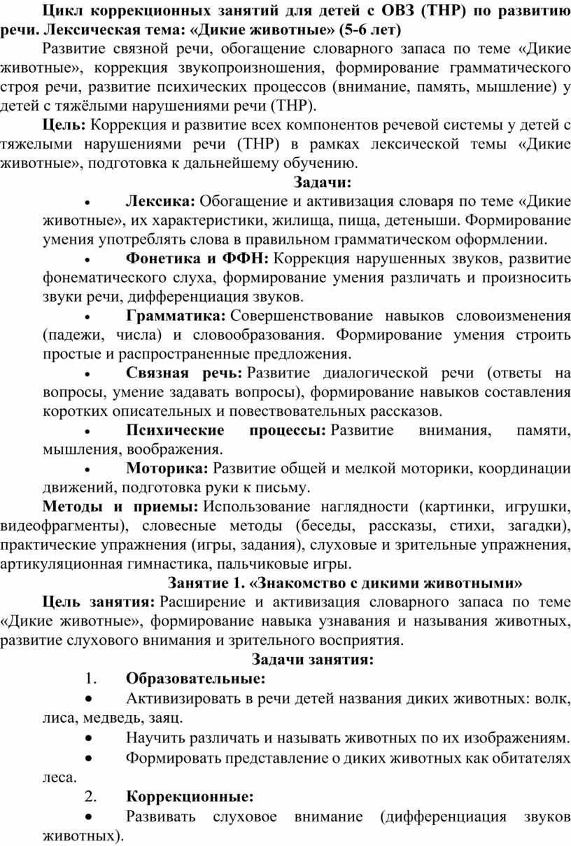 Развитие связной речи, обогащение словарного запаса по теме «Дикие животные», коррекция звукопроизношения, формирование грамматического строя речи, развитие психических процессов (внимание, память, мышление) у детей с тяжёлыми нарушениями речи (ТНР).