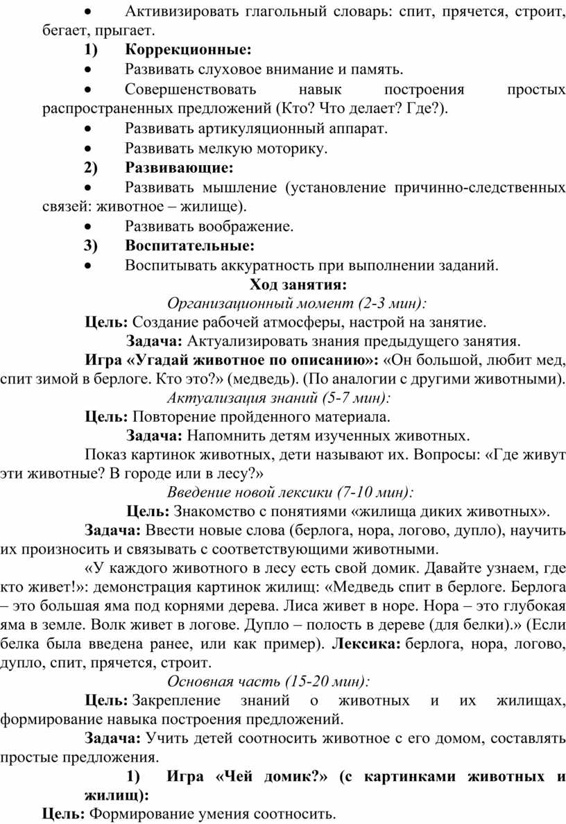 · Лексика: Обогащение и активизация словаря по теме «Дикие животные», их характеристики, жилища, пища, детеныши. Формирование умения употреблять слова в правильном грамматическом оформлении.