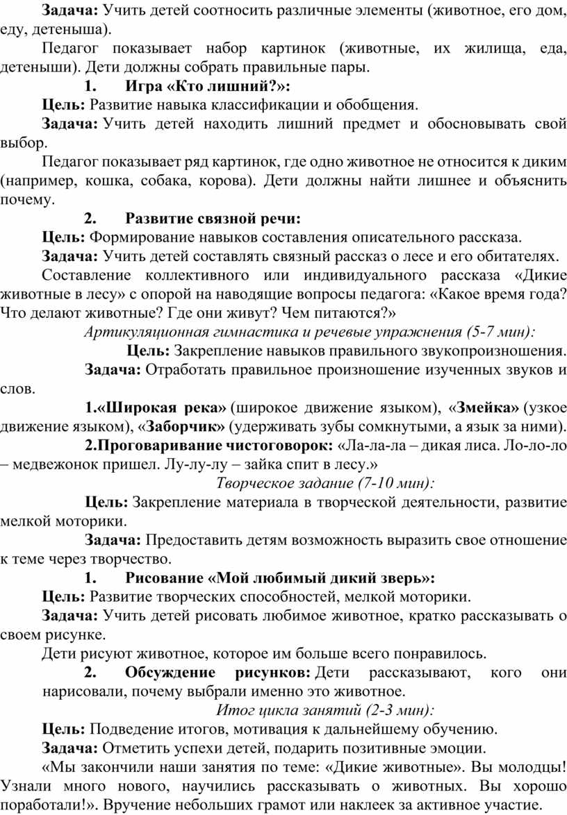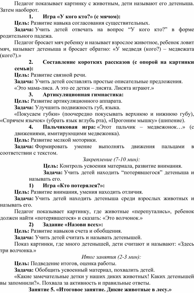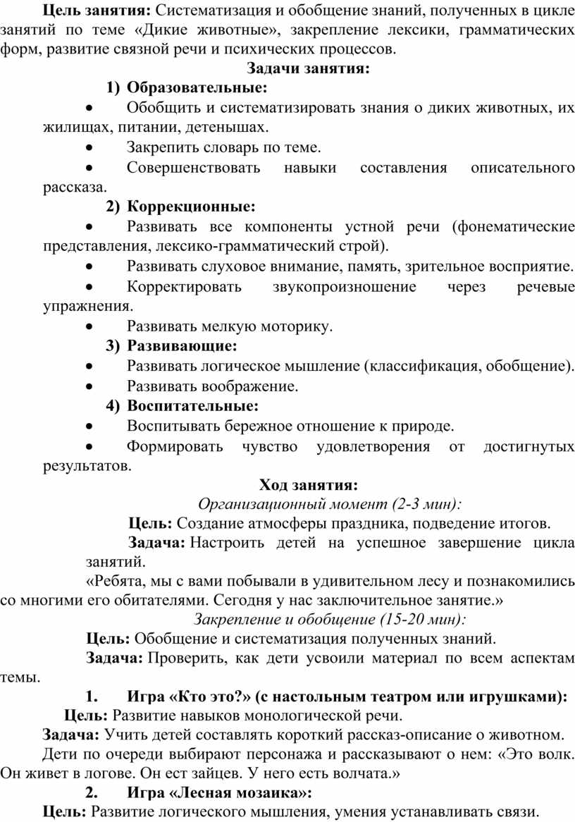 Цель занятия: Систематизация и обобщение знаний, полученных в цикле занятий по теме «Дикие животные», закрепление лексики, грамматических форм, развитие связной речи и психических процессов.