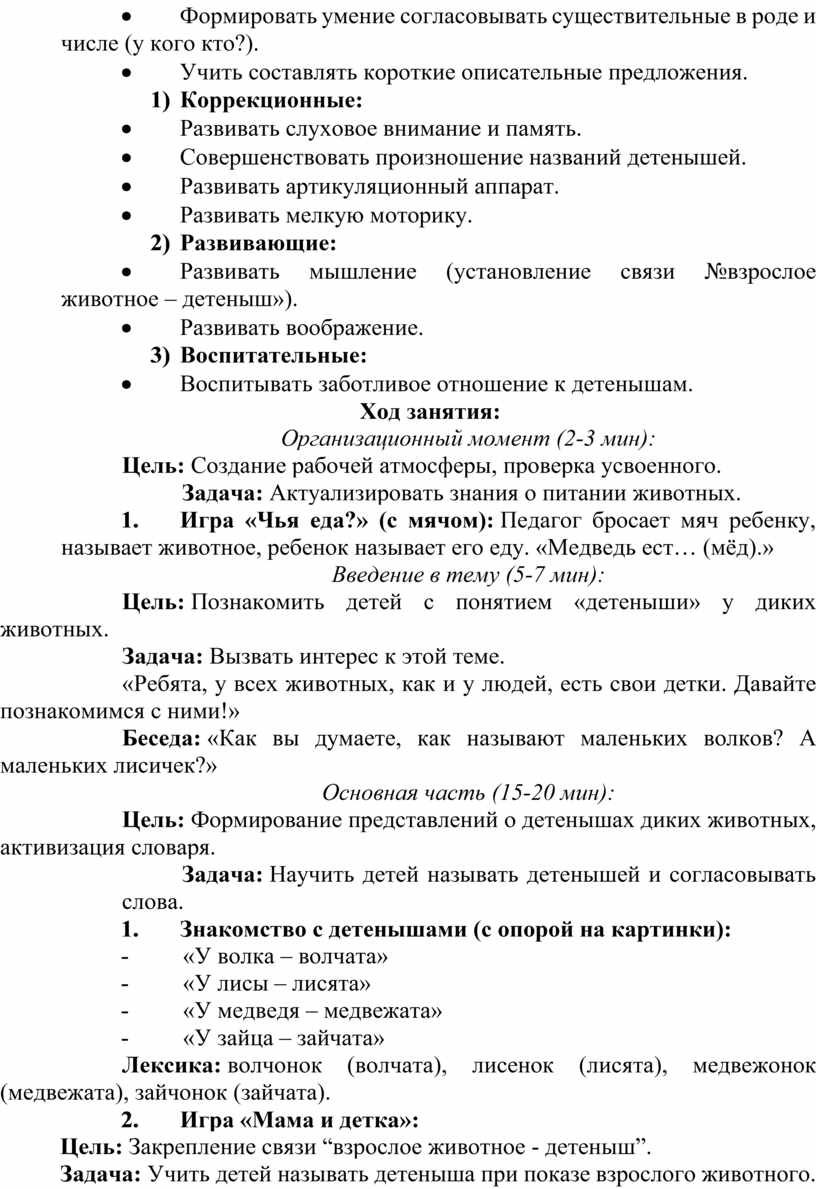 Цель занятия: Расширение словарного запаса по теме «Детеныши диких животных», формирование навыка называния детенышей, закрепление навыка согласования существительных, развитие связной речи.