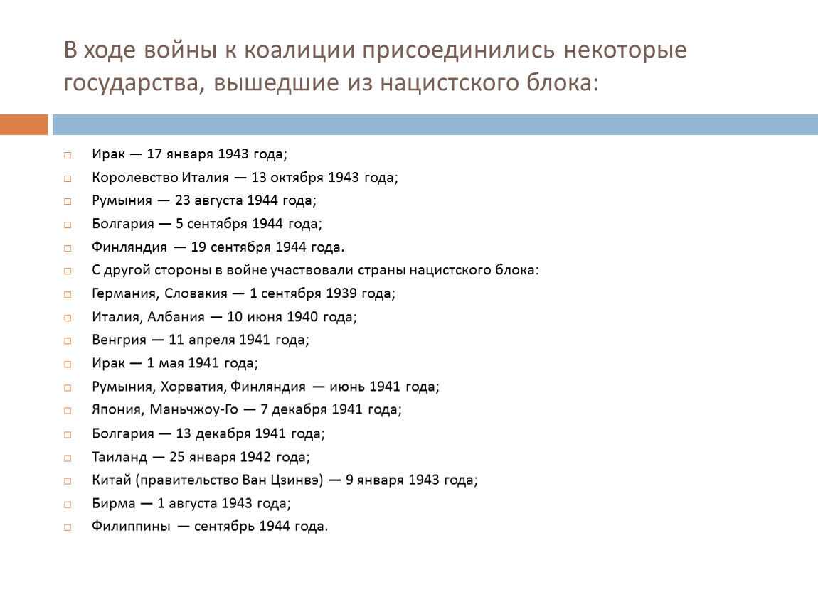 В ходе войны к коалиции присоединились некоторые государства, вышедшие из нацистского блока: