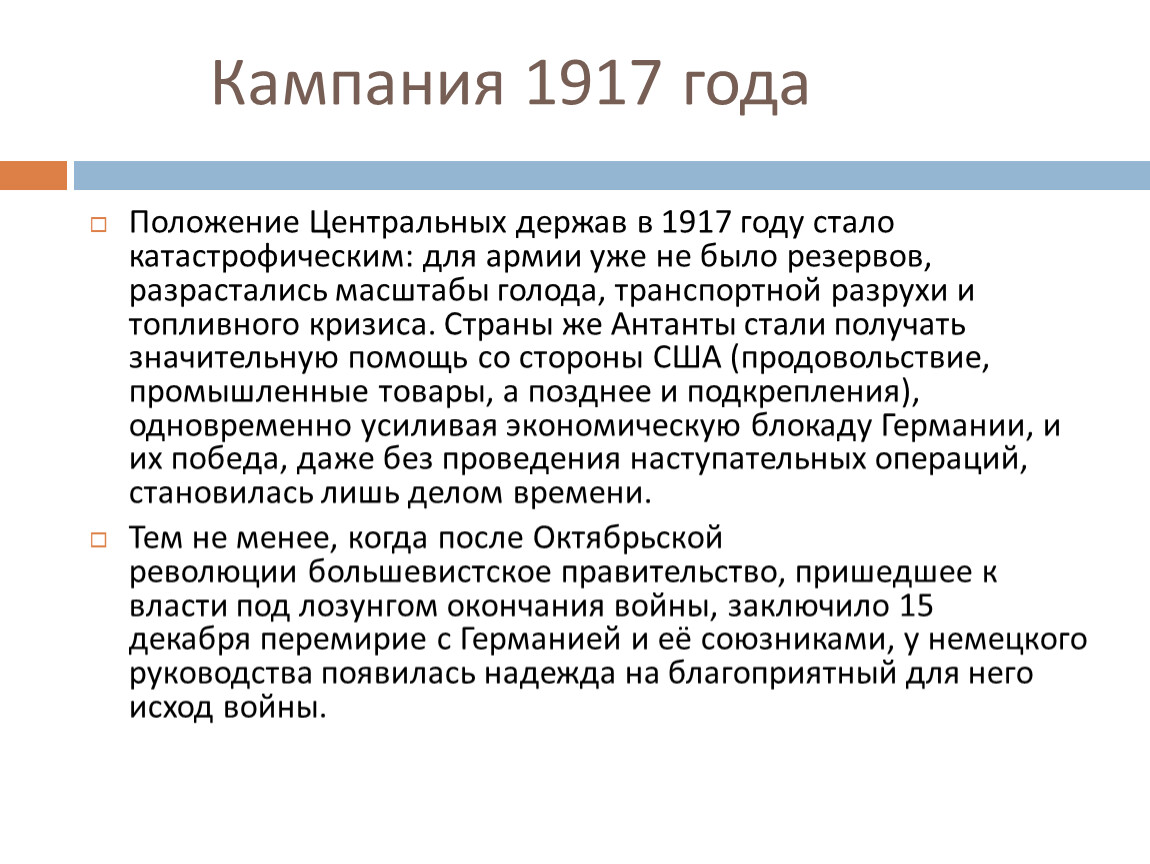 Тем не менее, когда после Октябрьской революции большевистское правительство, пришедшее к власти под лозунгом окончания войны, заключило 15 декабря перемирие с Германией и её союзниками, у немецкого руководства появилась надежда на благоприятный для него исход войны.