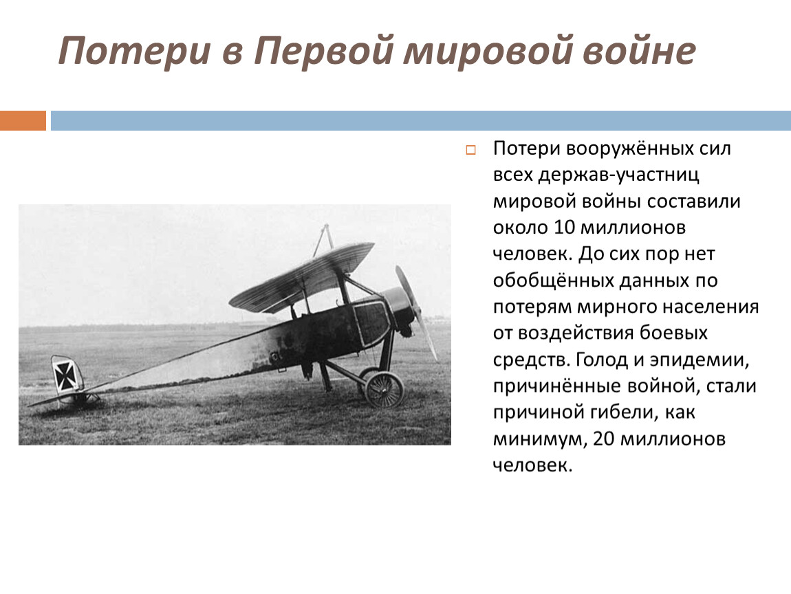 Потери вооружённых сил всех держав-участниц мировой войны составили около 10 миллионов человек. До сих пор нет обобщённых данных по потерям мирного населения от воздействия боевых средств. Голод и эпидемии, причинённые войной, стали причиной гибели, как минимум, 20 миллионов человек.