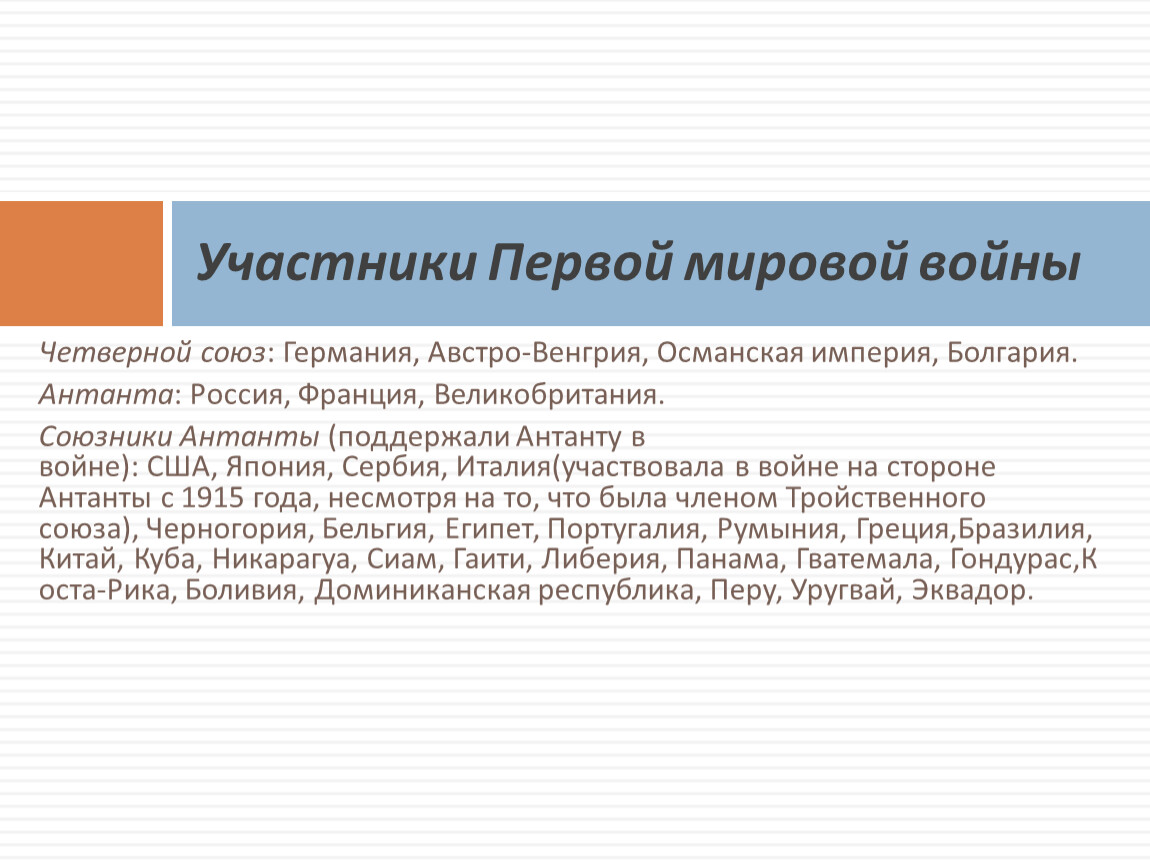 Союзники Антанты (поддержали Антанту в войне): США, Япония, Сербия, Италия(участвовала в войне на стороне Антанты с 1915 года, несмотря на то, что была членом Тройственного союза), Черногория, Бельгия, Египет, Португалия, Румыния, Греция,Бразилия, Китай, Куба, Никарагуа, Сиам, Гаити, Либерия, Панама, Гватемала, Гондурас,Коста-Рика, Боливия, Доминиканская республика, Перу, Уругвай, Эквадор.