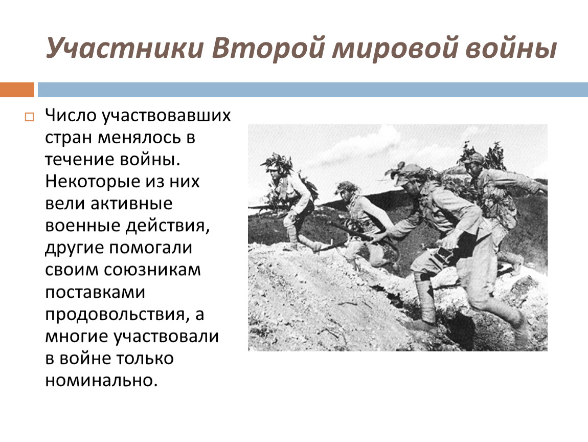 Число участвовавших стран менялось в течение войны. Некоторые из них вели активные военные действия, другие помогали своим союзникам поставками продовольствия, а многие участвовали в войне только номинально.