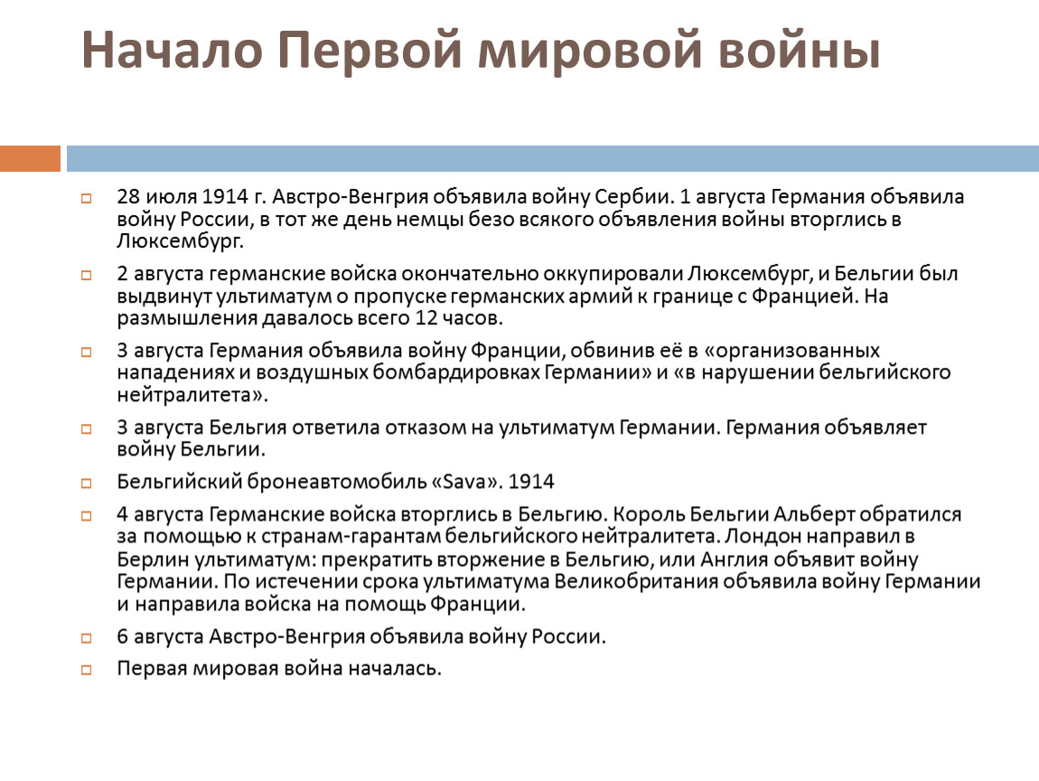 28 июля 1914 г. Австро-Венгрия объявила войну Сербии. 1 августа Германия объявила войну России, в тот же день немцы безо всякого объявления войны вторглись в Люксембург.