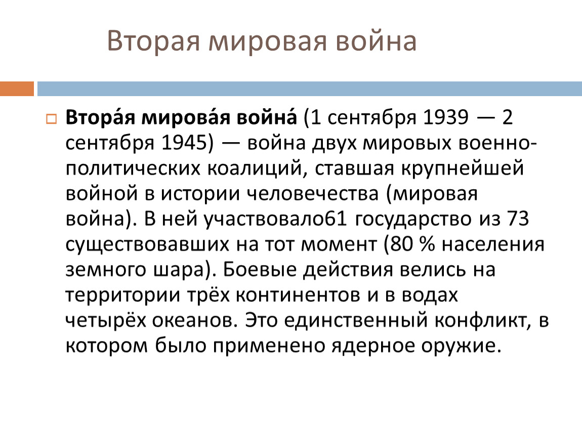 Втора́я мирова́я война́ (1 сентября 1939 — 2 сентября 1945) — война двух мировых военно-политических коалиций, ставшая крупнейшей войной в истории человечества (мировая война). В ней участвовало61 государство из 73 существовавших на тот момент (80 % населения земного шара). Боевые действия велись на территории трёх континентов и в водах четырёх океанов. Это единственный конфликт, в котором было применено ядерное оружие.