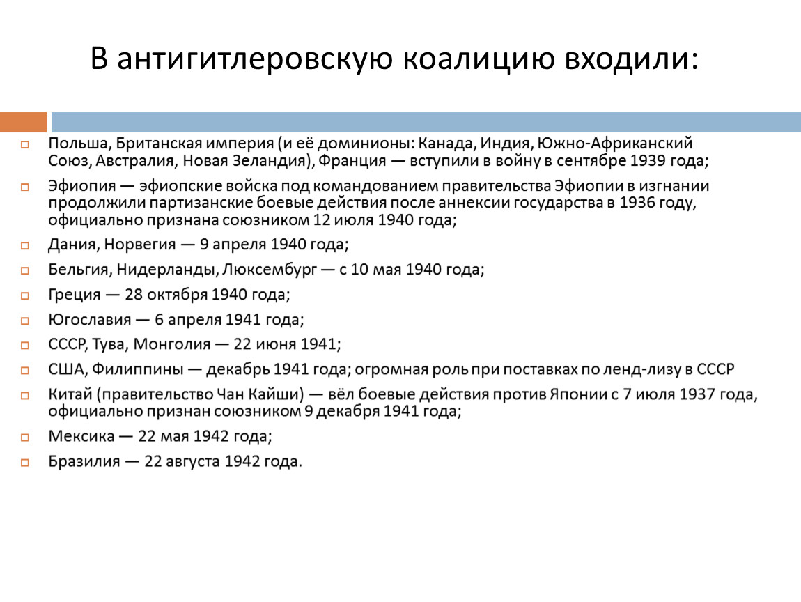 Польша, Британская империя (и её доминионы: Канада, Индия, Южно-Африканский Союз, Австралия, Новая Зеландия), Франция — вступили в войну в сентябре 1939 года;
