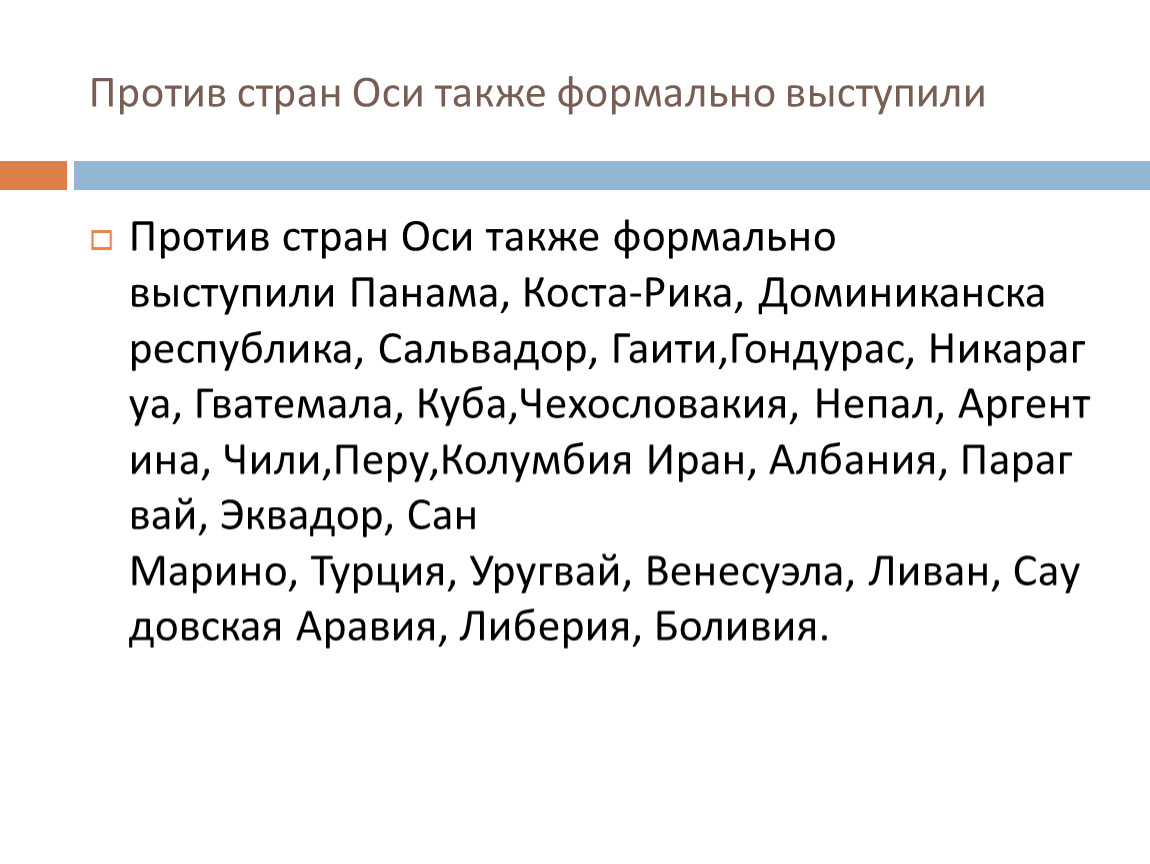 Против стран Оси также формально выступили Панама, Коста-Рика, Доминиканска республика, Сальвадор, Гаити,Гондурас, Никарагуа, Гватемала, Куба,Чехословакия, Непал, Аргентина, Чили,Перу,Колумбия Иран, Албания, Парагвай, Эквадор, Сан Марино, Турция, Уругвай, Венесуэла, Ливан, Саудовская Аравия, Либерия, Боливия.