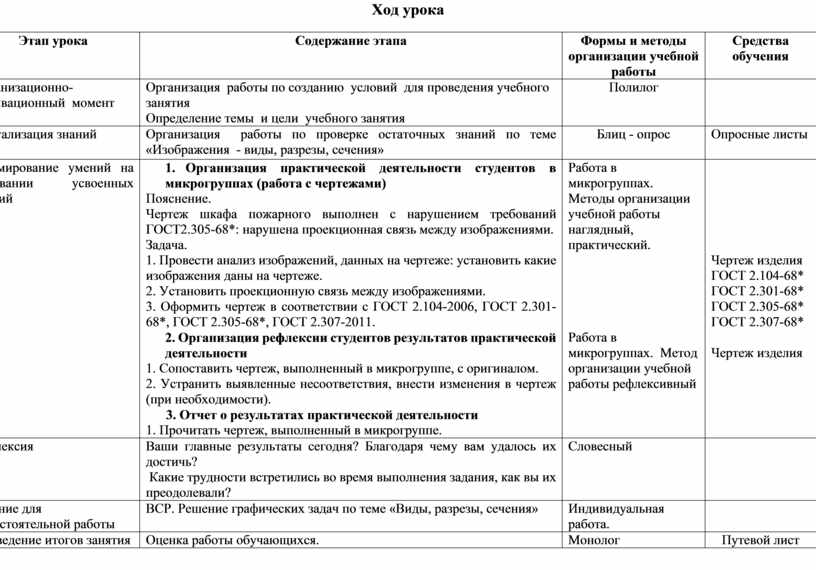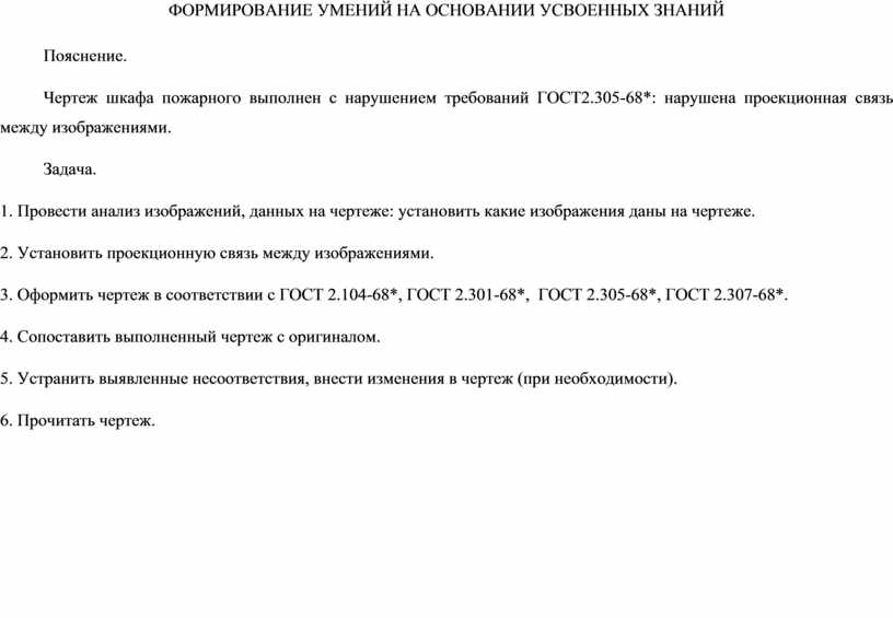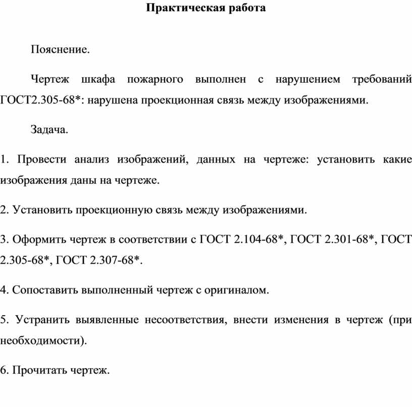1. Организация практической деятельности студентов в микрогруппах (работа с чертежами) Пояснение. Чертеж шкафа пожарного выполнен с нарушением требований ГОСТ2.305-68*: нарушена проекционная связь между изображениями. Задача. 1. Провести анализ изображений, данных на чертеже: установить какие изображения даны на чертеже. 2. Установить проекционную связь между изображениями. 3. Оформить чертеж в соответствии с ГОСТ 2.104-2006, ГОСТ 2.301-68*, ГОСТ 2.305-68*, ГОСТ 2.307-2011. 2. Организация рефлексии студентов результатов практической деятельности 1. Сопоставить чертеж, выполненный в микрогруппе, с оригиналом. 2. Устранить выявленные несоответствия, внести изменения в чертеж (при необходимости). 3. Отчет о результатах практической деятельности 1. Прочитать чертеж, выполненный в микрогруппе. |