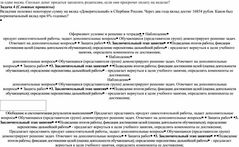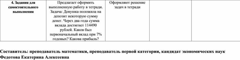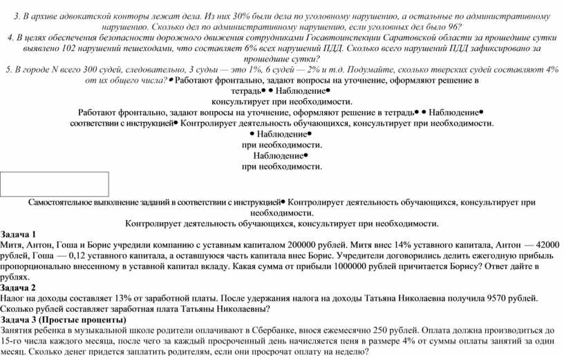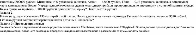 Контролирует деятельность обучающихся, консультирует при необходимости. Задача 1 Митя, Антон, Гоша и Борис учредили компанию с уставным капиталом 200000 рублей. Митя внес 14% уставного капитала, Антон — 42000 рублей, Гоша — 0,12 уставного капитала, а оставшуюся часть капитала внес Борис. Учредители договорились делить ежегодную прибыль пропорционально внесенному в уставной капитал вкладу. Какая сумма от прибыли 1000000 рублей причитается Борису? Ответ дайте в рублях. Задача 2 Налог на доходы составляет 13% от заработной платы. После удержания налога на доходы Татьяна Николаевна получила 9570 рублей. Сколько рублей составляет заработная плата Татьяны Николаевны? Задача 3 (Простые проценты) Занятия ребенка в музыкальной школе родители оплачивают в Сбербанке, внося ежемесячно 250 рублей. Оплата должна производиться до 15-го числа каждого месяца, после чего за каждый просроченный день начисляется пеня в размере 4% от суммы оплаты занятий за один месяц. Сколько денег придется заплатить родителям, если они просрочат оплату на неделю? Задача 4 (Сложные проценты) Вкладчик положил некоторую сумму на вклад «Доверительный» в Сбербанк России. Через два года вклад достиг 16854 рубля. Каков был первоначальный вклад при 6% годовых?
