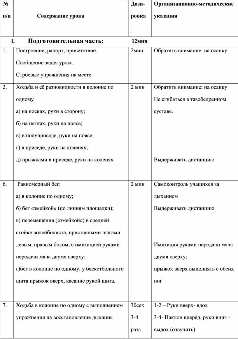 Равномерный бег: а) в колонне по одному; б) бег «змейкой» (по линиям площадки); в) перемещения («змейкой») в средней стойке волейболиста, приставными шагами левым, правым боком, с имитацией руками передачи мяча двумя сверху; г)бег в колонне по одному, у баскетбольного щита прыжок вверх, касание рукой щита.