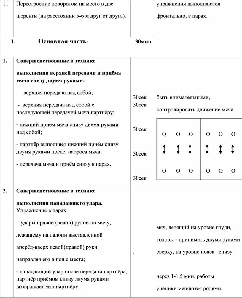 Совершенствование в технике выполнения верхней передачи и приёма мяча снизу двумя руками: – верхняя передача над собой; - верхняя передача над собой с последующей передачей мяча партнёру; - нижний приём мяча снизу двумя руками над собой; - партнёр выполняет нижний приём снизу двумя руками после наброса мяча; - передача мяча и приём снизу в парах.