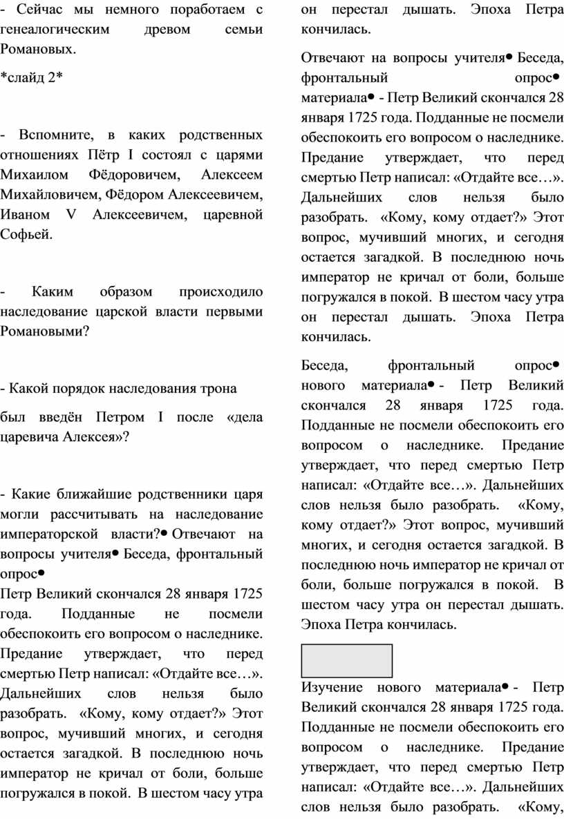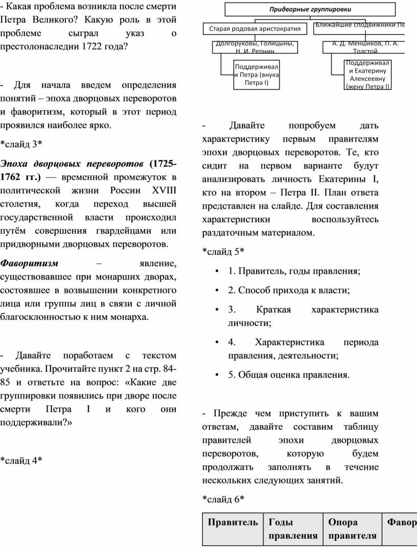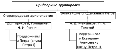 - Давайте поработаем с текстом учебника. Прочитайте пункт 2 на стр. 84-85 и ответьте на вопрос: «Какие две группировки появились при дворе после смерти Петра I и кого они поддерживали?»
