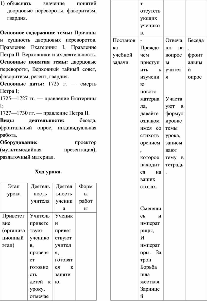 Основное содержание темы: Причины и сущность дворцовых переворотов. Правление Екатерины I. Правление Петра II. Верховники и их деятельность.