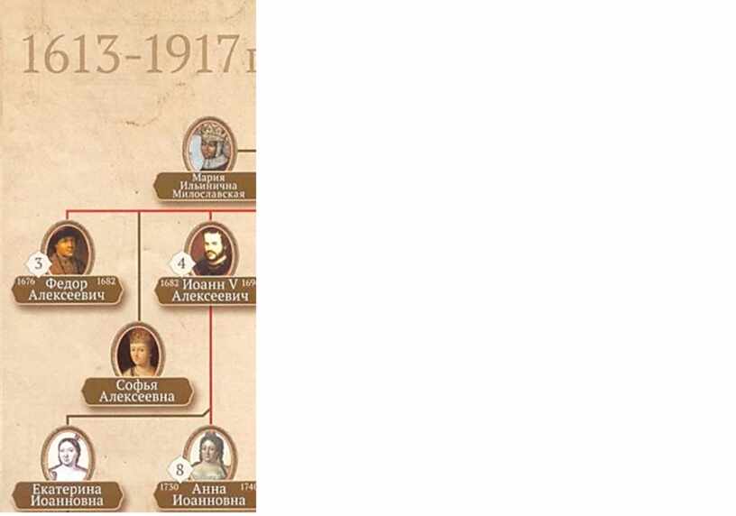 - Вспомните, в каких родственных отношениях Пётр I состоял с царями Михаилом Фёдоровичем, Алексеем Михайловичем, Фёдором Алексеевичем, Иваном V Алексеевичем, царевной Софьей.