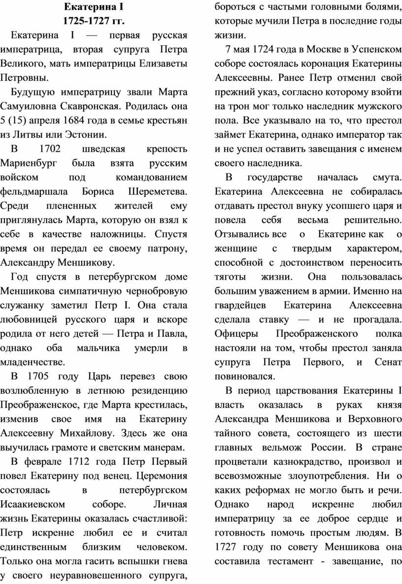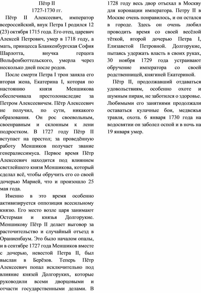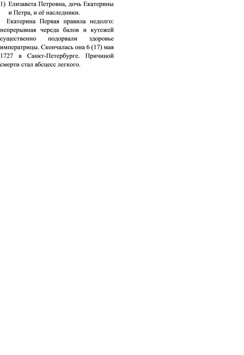 Основные даты: 1725 г. — смерть Петра I;