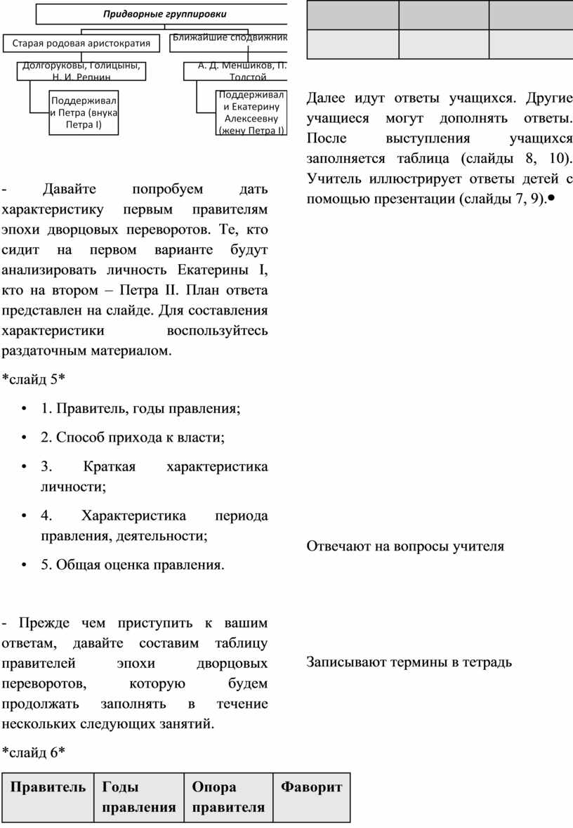 - Прежде чем приступить к вашим ответам, давайте составим таблицу правителей эпохи дворцовых переворотов, которую будем продолжать заполнять в течение нескольких следующих занятий. *слайд 6*