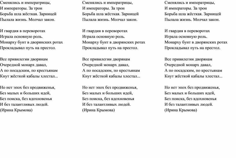 Сменялись и императрицы, И императоры. За трон Борьба шла жёсткая. Зарницей Пылала жизнь. Молчал закон.